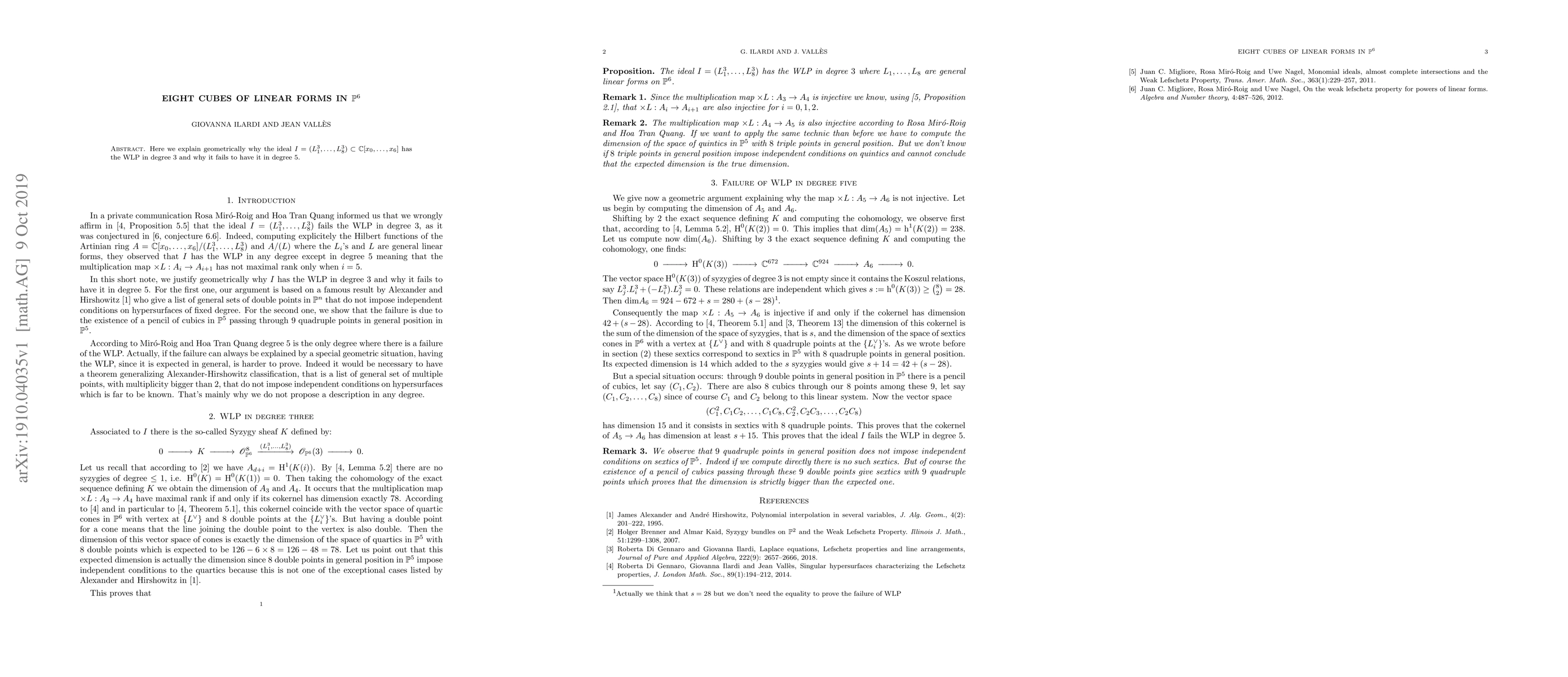 Here we explain geometrically why the ideal I = (L 3 1 ,. .. , L 3 8) $\subset$ C[x 0 ,. .. , x 6 ] has the WLP in degree 3 and why it fails to have it in degree 5.