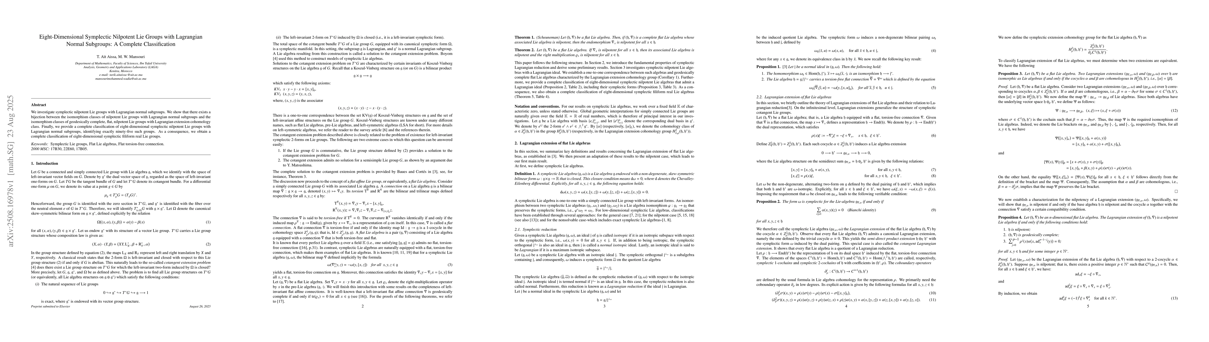 We investigate symplectic nilpotent Lie groups with Lagrangian normal subgroups. We show that there exists a bijection between the isomorphism classes of nilpotent Lie groups with Lagrangian normal subgroups and the isomorphism classes of geodesically complete, flat, nilpotent Lie groups with Lagrangian extension cohomology class. Finally, we provide a complete classification of eight-dimensional symplectic nilpotent Lie groups with Lagrangian normal subgroups, identifying exactly ninety-five such groups. As a consequence, we obtain a complete classification of eight-dimensional symplectic filiform real Lie groups.