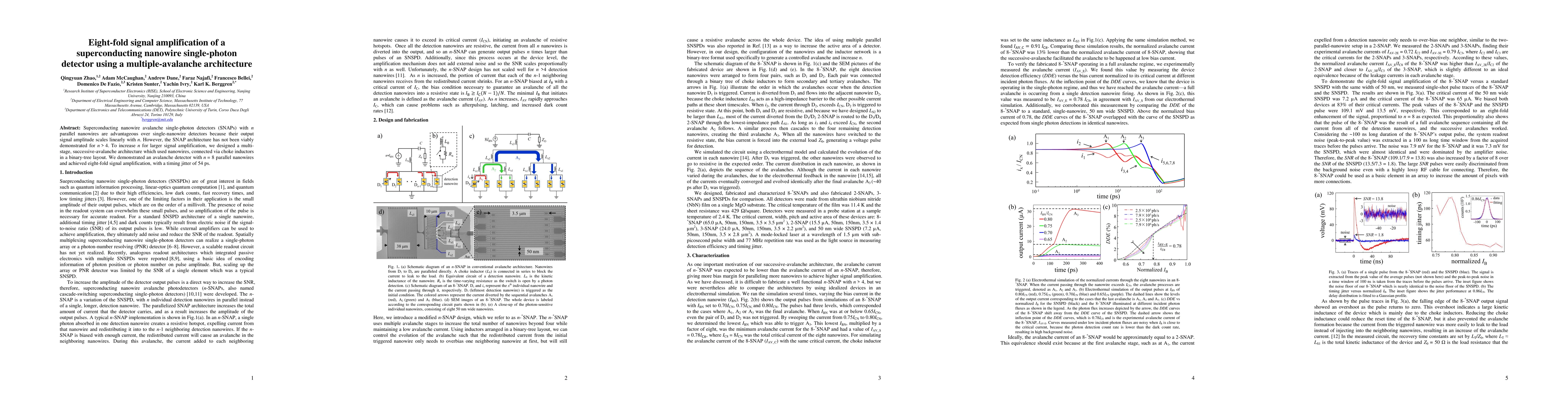 This paper presents an eight-fold signal amplification in a superconducting nanowire single-photon detector (SNAP) using a multi-stage, successive-avalanche architecture with eight parallel nanowires, achieving a timing jitter of 54 ps. The design employs a binary-tree layout with choke inductors to connect nanowires, overcoming previous limitations in larger SNAP architectures.