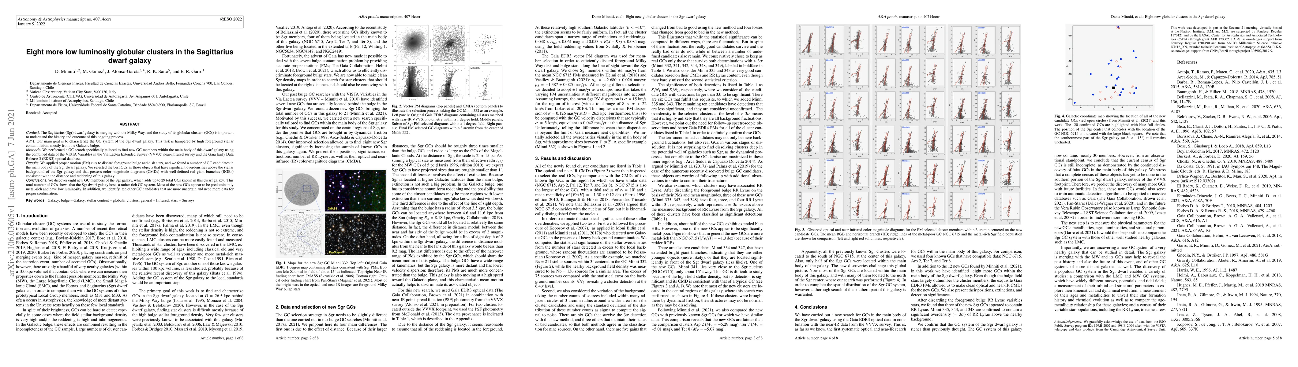This research identifies eight new globular clusters (GCs) in the Sagittarius dwarf galaxy, bringing the total to 29. The study used near-infrared and optical data from VVVX and Gaia EDR3, applying proper motion cuts to distinguish Sgr GCs from foreground stars. The new GCs are mostly metal-rich and low luminosity, indicating a rich GC system in the Sgr dwarf galaxy.