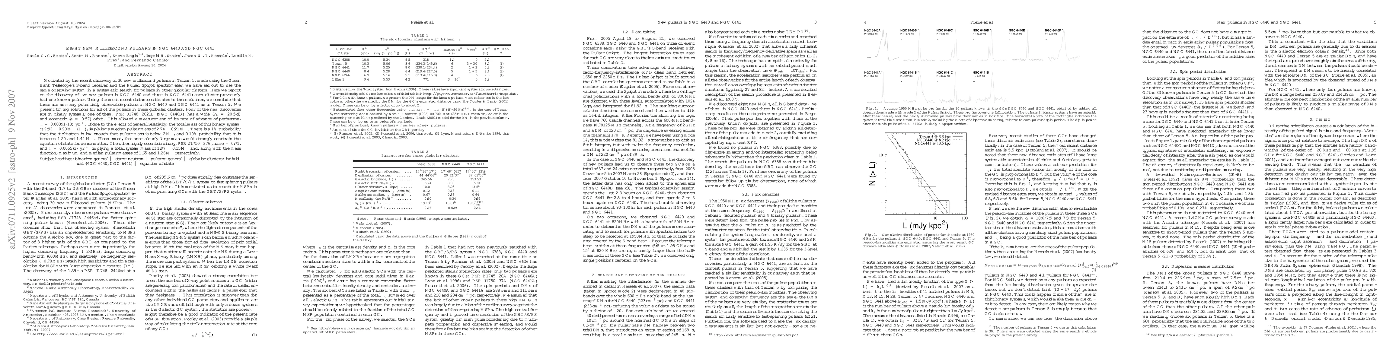 Motivated by the recent discovery of 30 new millisecond pulsars in Terzan 5, made using the Green Bank Telescope's S-band receiver and the Pulsar Spigot spectrometer, we have set out to use the same observing system in a systematic search for pulsars in other globular clusters. Here we report on the discovery of five new pulsars in NGC 6440 and three in NGC 6441; each cluster previously had one known pulsar. Using the most recent distance estimates to these clusters, we conclude that there are as many potentially observable pulsars in NGC 6440 and NGC 6441 as in Terzan 5. We present timing solutions for all of the pulsars in these globular clusters. Four of the new discoveries are in binary systems; one of them, PSR J1748-2021B (NGC 6440B), has a wide (P_b = 20.5 d) and eccentric (e = 0.57) orbit. This allowed a measurement of its rate of advance of periastron: 0.00391(18) degrees per year. If due to the effects of general relativity, the total mass of this binary system is 2.92 +/- 0.20 solar masses (1 sigma), implying a median pulsar mass of 2.74 +/- 0.21 solar masses. There is a 1 % probability that the inclination is low enough that pulsar mass is below 2 solar masses, and 0.10 % probability that it is between 1.20 and 1.44 solar masses. If confirmed, this anomalously large mass would strongly constrain the equation of state for dense matter. The other highly eccentric binary, PSR J1750-37A, has e = 0.71, and periastron advance of 0.0055(3) degrees per year, implying a total system mass of 1.97 +/-0.15 solar masses and, along with the mass function, maximum and median pulsar masses of 1.65 and 1.26 solar masses respectively.