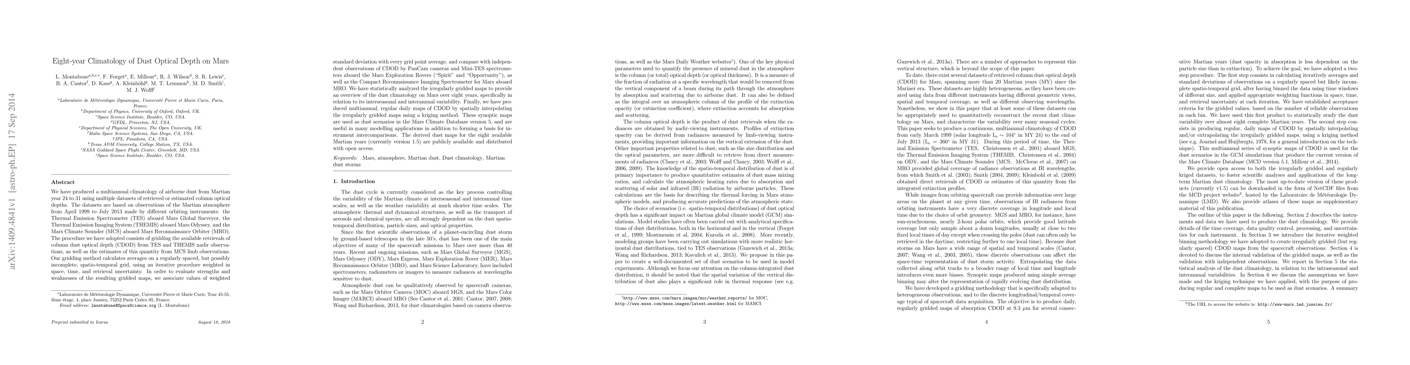 This study presents an eight-year climatology of Martian dust optical depth from Martian years 24 to 31, using data from TES, THEMIS, and MCS instruments. The research provides multiannual, regularly spaced maps of dust optical depth, validated through independent observations, and is useful for modeling and instrument intercomparisons.