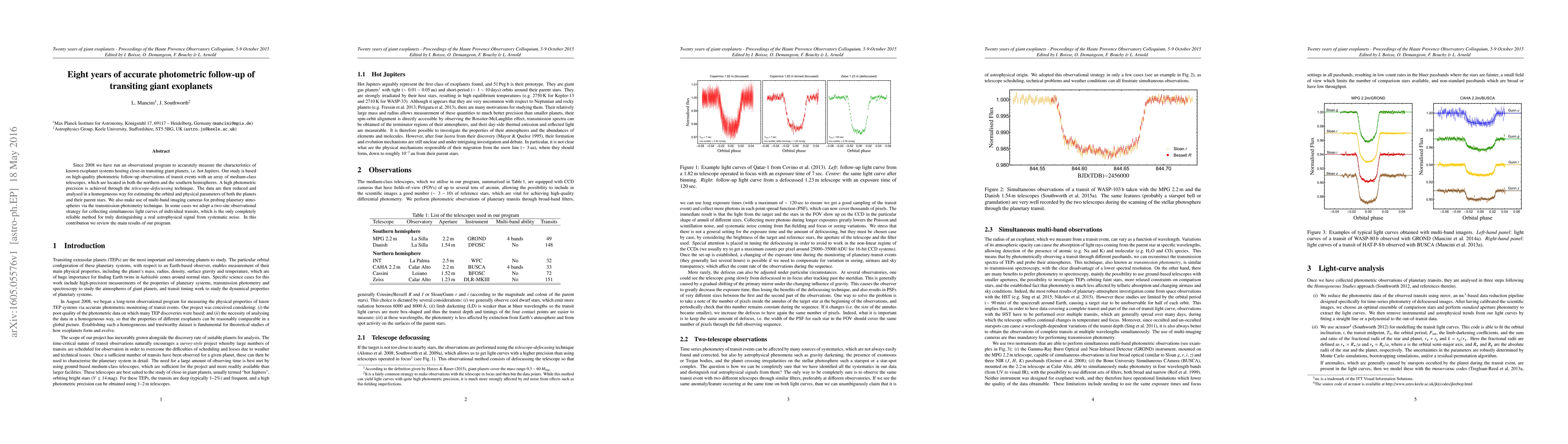 A 8-year observational program tracked transiting giant exoplanets with high precision, revealing key parameters of their orbits and atmospheres. The findings provide valuable insights into the properties of hot Jupiters and the potential for atmospheric studies via transmission-photometry.