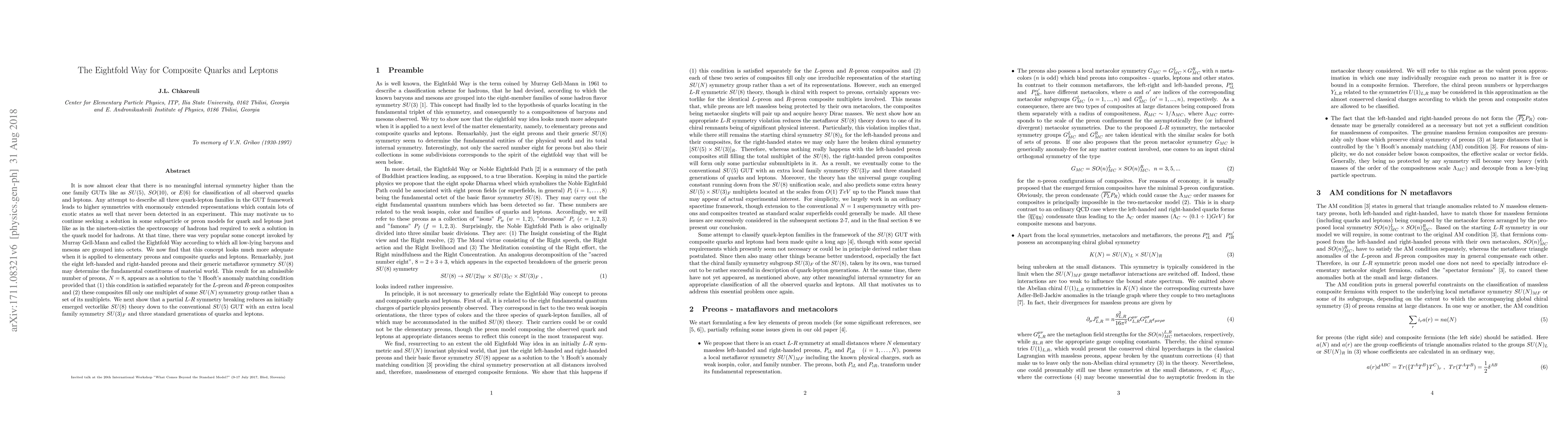 It is now almost clear that there is no meaningful internal symmetry higher than the one family GUTs like as $SU(5)$, $SO(10)$, or $E(6)$ for classification of all observed quarks and leptons. Any attempt to describe all three quark-lepton families in the GUT framework leads to higher symmetries with enormously extended representations which contain lots of exotic states as well that never been detected in an experiment. This may motivate us to continue seeking a solution in some subparticle or preon models for quark and leptons just like as in the nineteen-sixties the spectroscopy of hadrons had required to seek a solution in the quark model for hadrons. At that time, there was very popular some concept invoked by Murray Gell-Mann and called the Eightfold Way according to which all low-lying baryons and mesons are grouped into octets. We now find that this concept looks much more adequate when it is applied to elementary preons and composite quarks and leptons. Remarkably, just the eight left-handed and right-handed preons and their generic metaflavor symmetry $SU(8)$ may determine the fundamental constituens of material world. This result for an admissible number of preons, $N=8$, appears as a solution to the 't Hooft's anomaly matching condition provided that (1) this condition is satisfied separately for the $L$-preon and $R$-preon composites and (2) these composites fill only one multiplet of some $SU(N)$ symmetry group rather than a set of its multiplets. We next show that a partial $L$-$R$ symmetry breaking reduces an initially emerged vectorlike $SU(8)$ theory down to the conventional $SU(5)$ GUT with an extra local family symmetry $SU(3)_{F}$ and three standard generations of quarks and leptons.