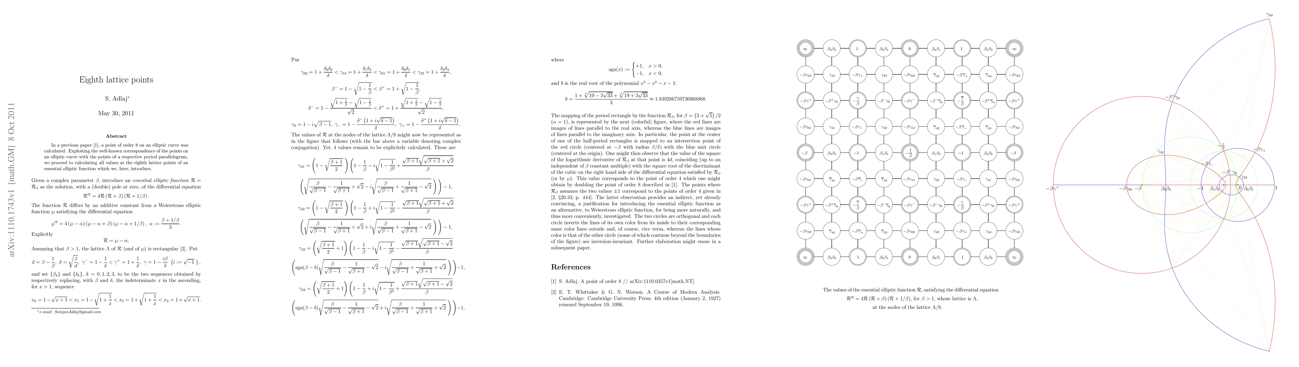 In a previous paper, a point of order 8 on an elliptic curve was calculated. Exploiting the well-known correspondence of the points on an elliptic curve with the points of a respective period parallelogram, we proceed to calculating all values at the eighth lattice points of an essential elliptic function which we introduce.
