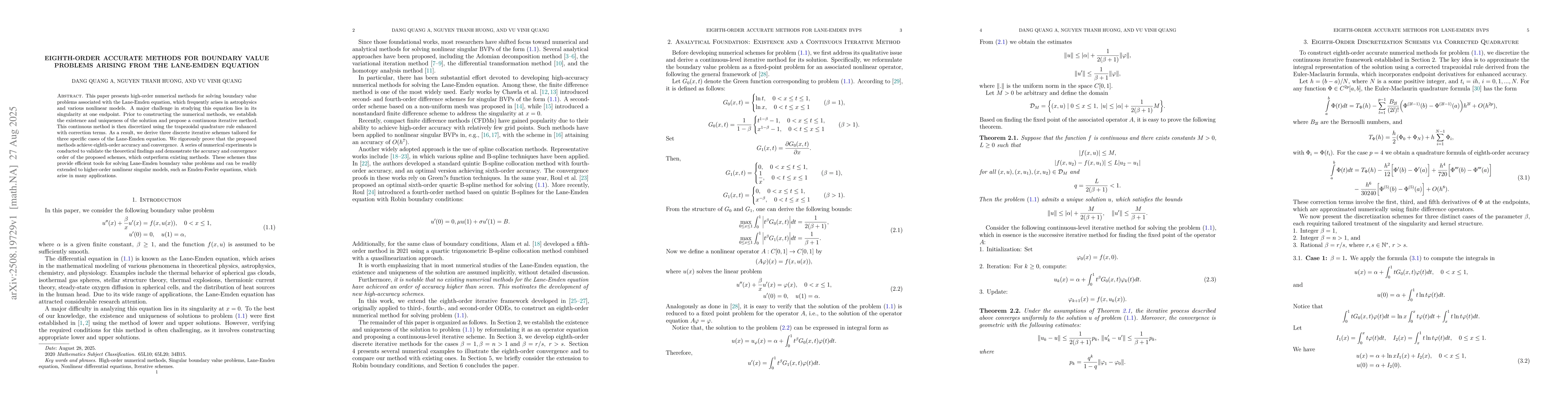 This paper presents high-order numerical methods for solving boundary value problems associated with the Lane-Emden equation, which frequently arises in astrophysics and various nonlinear models. A major challenge in studying this equation lies in its singularity at one endpoint. Prior to constructing the numerical methods, we establish the existence and uniqueness of the solution and propose a continuous iterative method. This continuous method is then discretized using the trapezoidal quadrature rule enhanced with correction terms. As a result, we derive three discrete iterative schemes tailored for three specific cases of the Lane-Emden equation. We rigorously prove that the proposed methods achieve eighth-order accuracy and convergence. A series of numerical experiments is conducted to validate the theoretical findings and demonstrate the accuracy and convergence order of the proposed schemes, which outperform existing methods. These schemes thus provide efficient tools for solving Lane-Emden boundary value problems and can be readily extended to higher-order nonlinear singular models, such as Emden-Fowler equations, which arise in many applications.