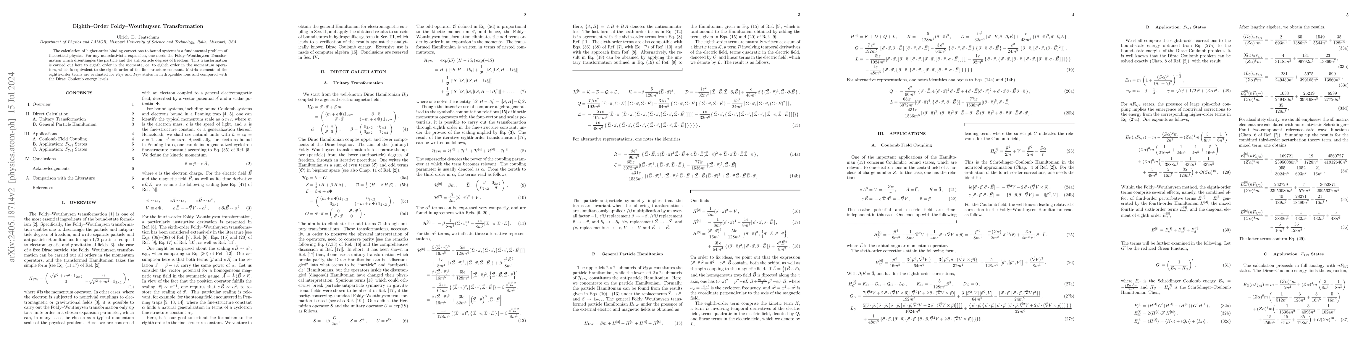 The calculation of higher-order binding corrections to bound systems is a fundamental problem of theoretical physics. For any nonrelativistic expansion, one needs the Foldy-Wouthuysen Transformation which disentangles the particle and the antiparticle degrees of freedom. This transformation is carried out here to eighth order in the momenta, or, to eighth order in the momentum operators, which is equivalent to the eighth order of the fine-structure constant. Matrix elements of the eighth-order terms are evaluated for F_5/2 and F_7/2 states in hydrogenlike ions and compared with the Dirac-Coulomb energy levels.
