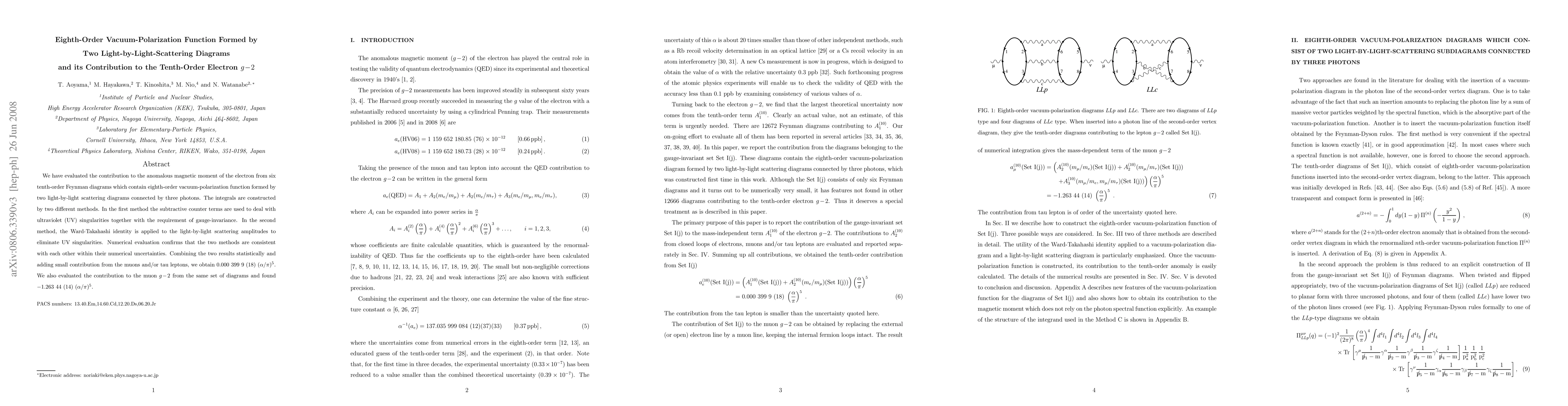 This paper evaluates the contribution of six tenth-order Feynman diagrams to the electron's anomalous magnetic moment, involving an eighth-order vacuum-polarization function from two light-by-light scattering diagrams. Both subtractive counter terms and the Ward-Takahashi identity are used to handle ultraviolet singularities, yielding consistent results.