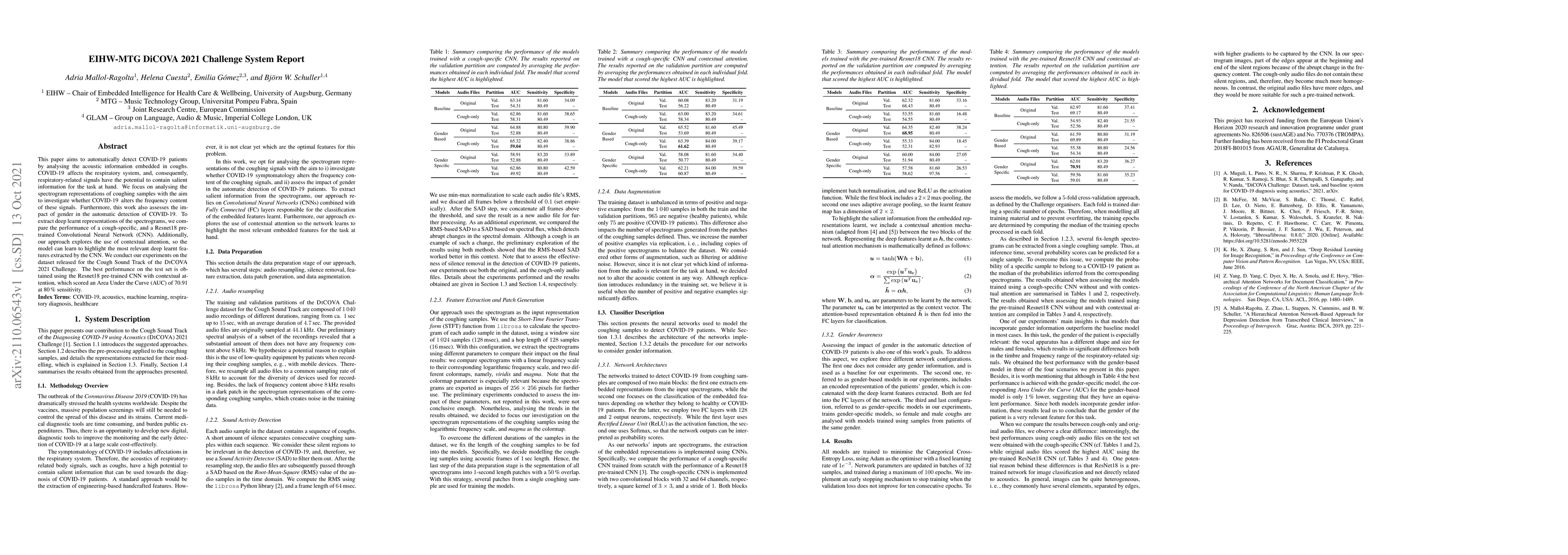 This paper aims to automatically detect COVID-19 patients by analysing the acoustic information embedded in coughs. COVID-19 affects the respiratory system, and, consequently, respiratory-related signals have the potential to contain salient information for the task at hand. We focus on analysing the spectrogram representations of coughing samples with the aim to investigate whether COVID-19 alters the frequency content of these signals. Furthermore, this work also assesses the impact of gender in the automatic detection of COVID-19. To extract deep learnt representations of the spectrograms, we compare the performance of a cough-specific, and a Resnet18 pre-trained Convolutional Neural Network (CNN). Additionally, our approach explores the use of contextual attention, so the model can learn to highlight the most relevant deep learnt features extracted by the CNN. We conduct our experiments on the dataset released for the Cough Sound Track of the DiCOVA 2021 Challenge. The best performance on the test set is obtained using the Resnet18 pre-trained CNN with contextual attention, which scored an Area Under the Curve (AUC) of 70.91 at 80% sensitivity.