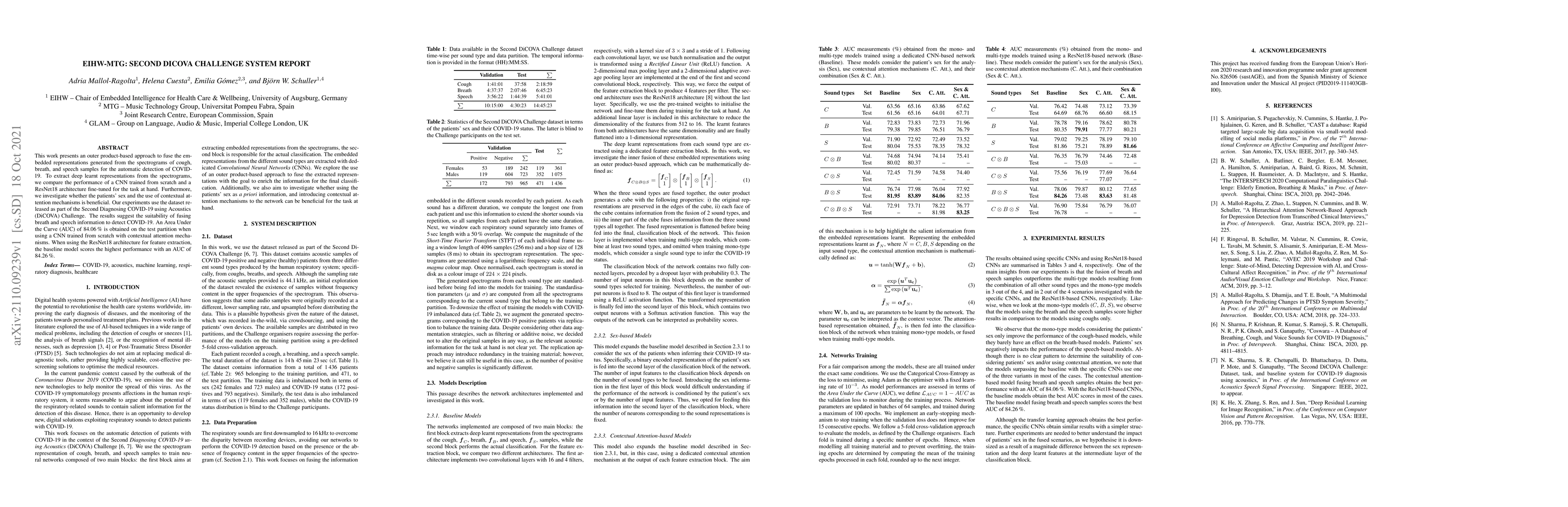 This work presents an outer product-based approach to fuse the embedded representations generated from the spectrograms of cough, breath, and speech samples for the automatic detection of COVID-19. To extract deep learnt representations from the spectrograms, we compare the performance of a CNN trained from scratch and a ResNet18 architecture fine-tuned for the task at hand. Furthermore, we investigate whether the patients' sex and the use of contextual attention mechanisms is beneficial. Our experiments use the dataset released as part of the Second Diagnosing COVID-19 using Acoustics (DiCOVA) Challenge. The results suggest the suitability of fusing breath and speech information to detect COVID-19. An Area Under the Curve (AUC) of 84.06% is obtained on the test partition when using a CNN trained from scratch with contextual attention mechanisms. When using the ResNet18 architecture for feature extraction, the baseline model scores the highest performance with an AUC of 84.26%.