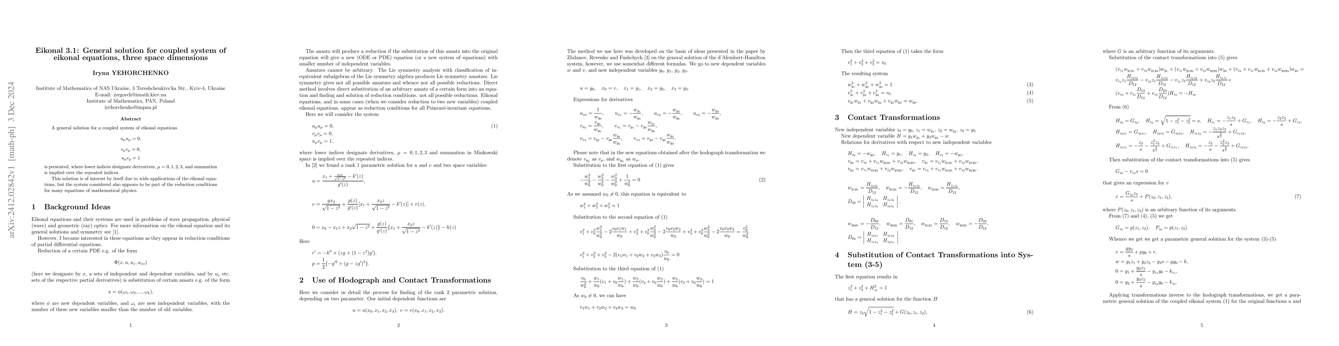 The paper presents a general solution for a coupled system of eikonal equations in three space dimensions, specifically addressing $u_\mu u_\mu =0$, $v_\mu v_\mu =0$, and $u_\mu v_\mu =1$. This solution has broad applications in mathematical physics and serves as part of the reduction conditions for many physical equations.