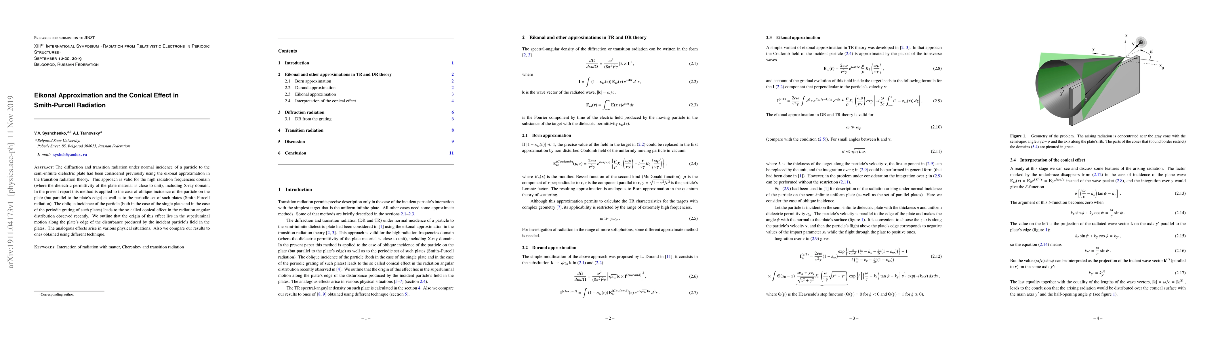 This paper explores the eikonal approximation for Smith-Purcell radiation, demonstrating its application to oblique incidence scenarios, and identifies the conical effect in radiation angular distribution as originating from superluminal motion along the plate's edge. Comparisons with alternative methods are also presented.