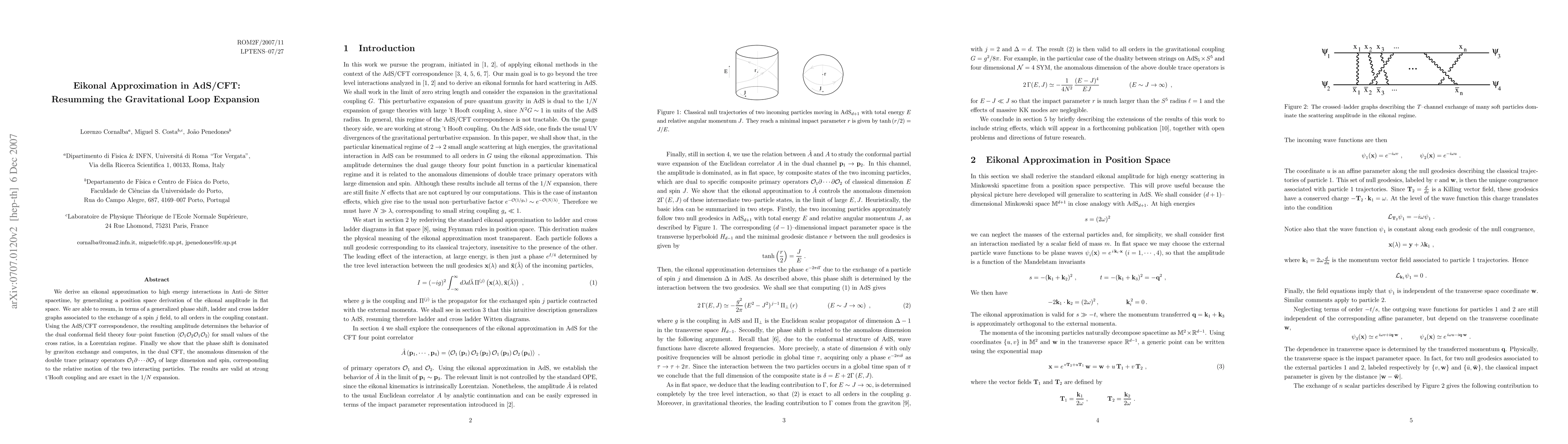 This paper derives an eikonal approximation for high-energy interactions in Anti-de Sitter spacetime, resums gravitational loop diagrams to all orders, and uses AdS/CFT to determine the behavior of the dual conformal field theory's four-point function. The study finds that graviton exchange dominates the phase shift, computing the anomalous dimension of large-dimensional, spin operators in the CFT.