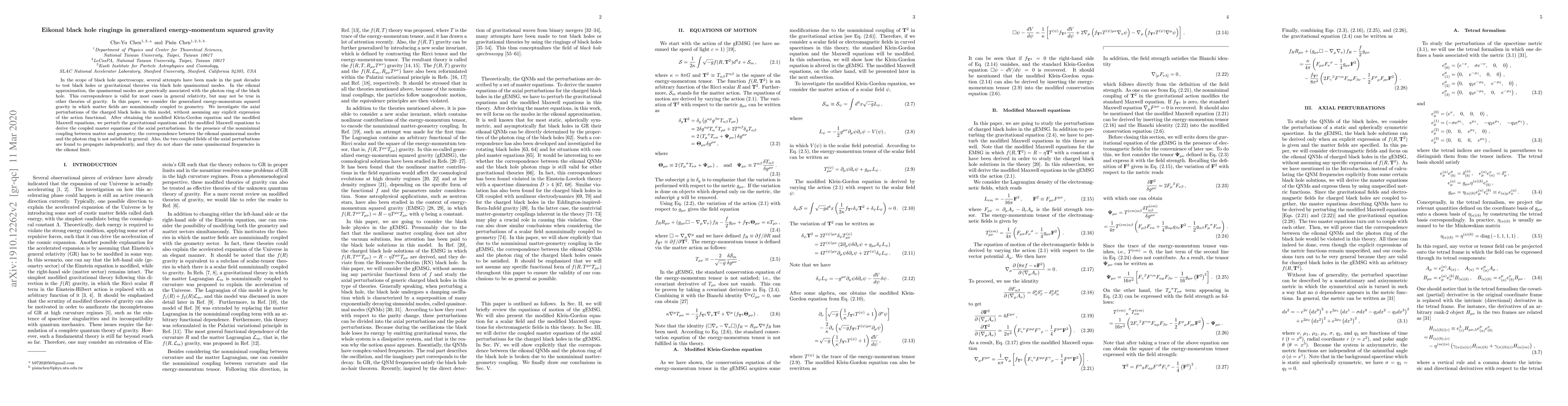 In the scope of black hole spectroscopy, several attempts have been made in the past decades in order to test black holes or gravitational theories via black hole quasinormal modes. In the eikonal approximation, the quasinormal modes are generically associated with the photon ring of the black hole. This correspondence is valid for most cases in general relativity, but may not be true in other theories of gravity. In this paper, we consider the generalized energy-momentum squared gravity in which matter fields are non-minimally coupled to geometry. We investigate the axial perturbations of the charged black holes in this model, without assuming any explicit expression of the action functional. After obtaining the modified Klein-Gordon equation and the modified Maxwell equations, we perturb the gravitational equations and the modified Maxwell equations to derive the coupled master equations of the axial perturbations. In the presence of the non-minimal coupling between matter and geometry, the correspondence between the eikonal quasinormal modes and the photon ring is not satisfied in general. Also, the two coupled fields of the axial perturbations are found to propagate independently and they do not share the same quasinormal frequencies in the eikonal limit.