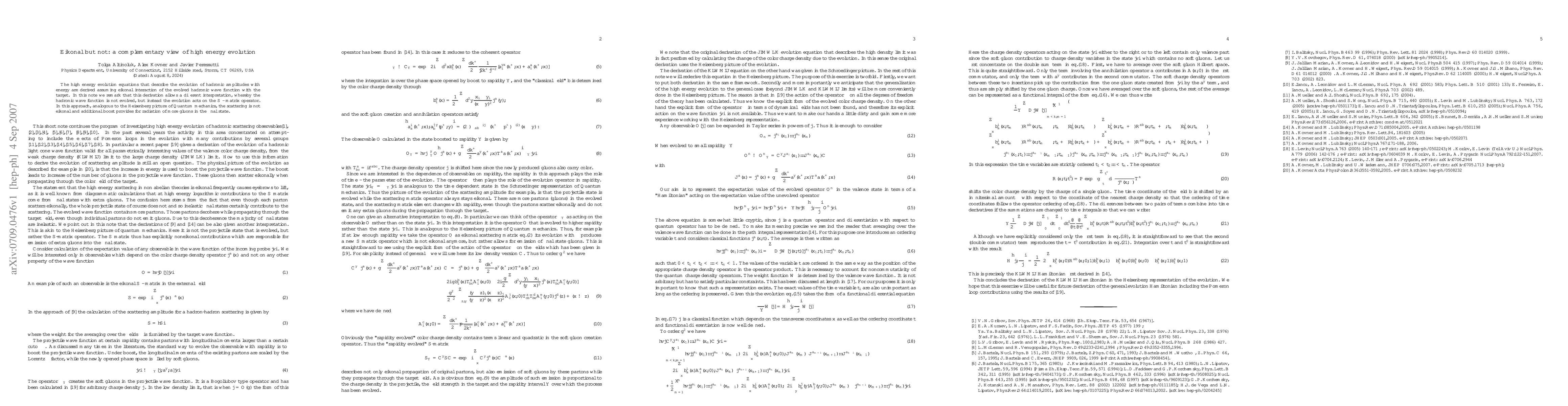 The high energy evolution equations that describe the evolution of hadronic amplitudes with energy are derived assuming eikonal interaction of the evolved hadronic wave function with the target. In this note we remark that this derivation allows a different interpretation, whereby the hadronic wave function is not evolved, but instead the evolution acts on the S - matrix operator. In this approach, analogous to the Heisenberg picture of Quantum mechanics, the scattering is not eikonal and additional boost provides for radiation of more gluons in the final state.