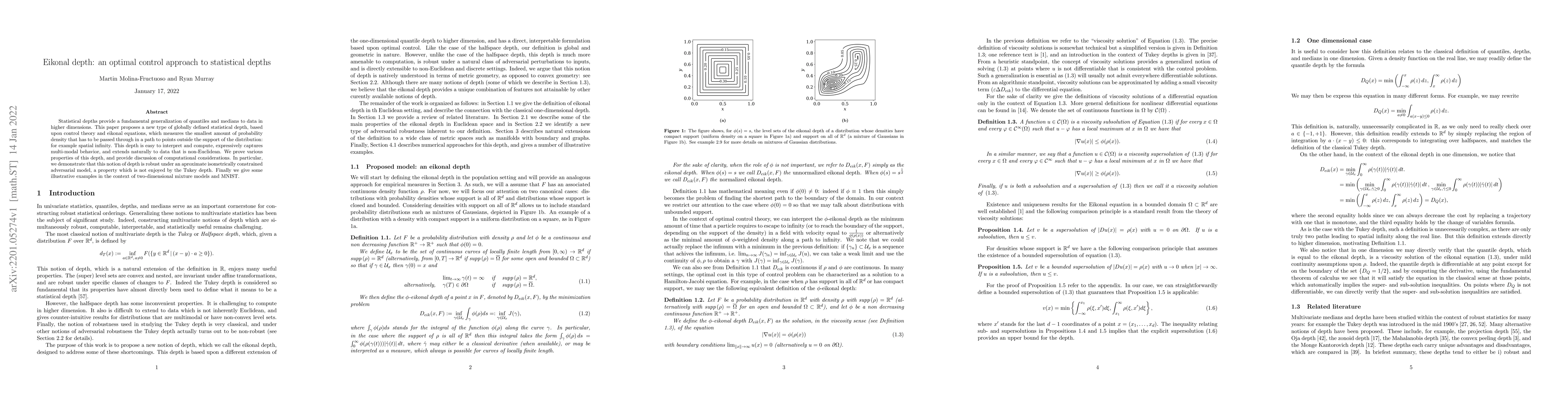 This paper proposes a novel statistical depth measure called eikonal depth, based on optimal control theory, which assesses the minimal probability density traversed to reach a point outside a distribution's support. This depth is robust, interpretable, and extends to non-Euclidean data, with demonstrated applications in mixture models and MNIST datasets.