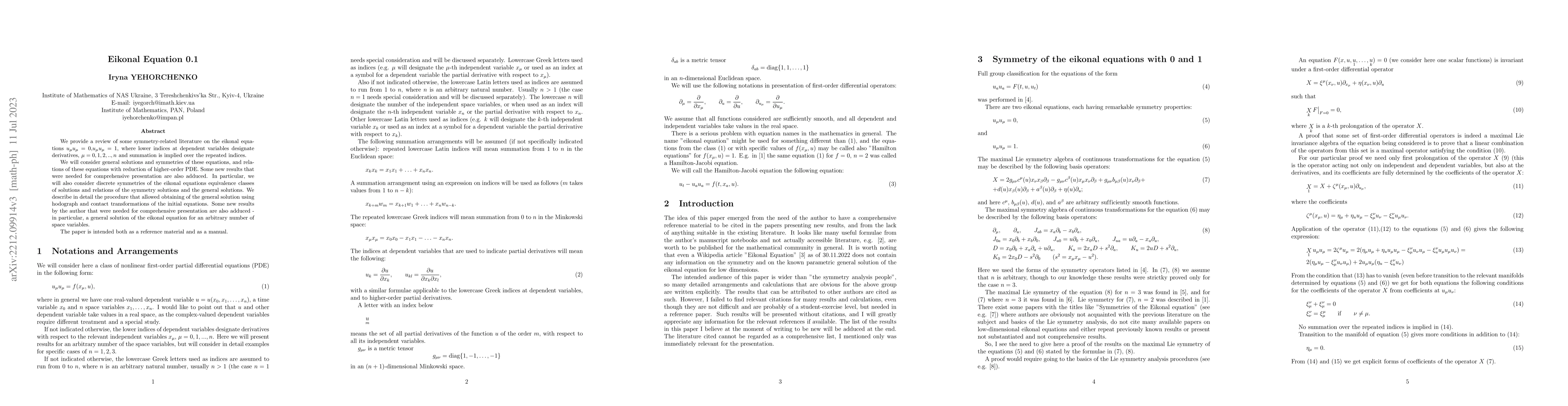 We provide a review of some symmetry-related literature on the eikonal equations $u_\mu u_\mu =0$,$u_\mu u_\mu =1$, where lower indices at dependent variables designate derivatives, $\mu=0,1,2,..,n$ and summation is implied over the repeated indices. We will consider general solutions and symmetries of these equations, and relations of these equations with the reduction of higher-order PDE. Some new results that were needed for the comprehensive presentation are also adduced. In particular, we will also consider discrete symmetries of the eikonal equations equivalence classes of solutions and relations of the symmetry solutions and the general solutions. We describe in detail the procedure that allowed obtaining of the general solution using hodograph and contact transformations of the initial equations. Some new results by the author that were needed for comprehensive presentation are also adduced - in particular, a general solution of the eikonal equation for an arbitrary number of space variables. The paper is intended both as reference material and as a manual.