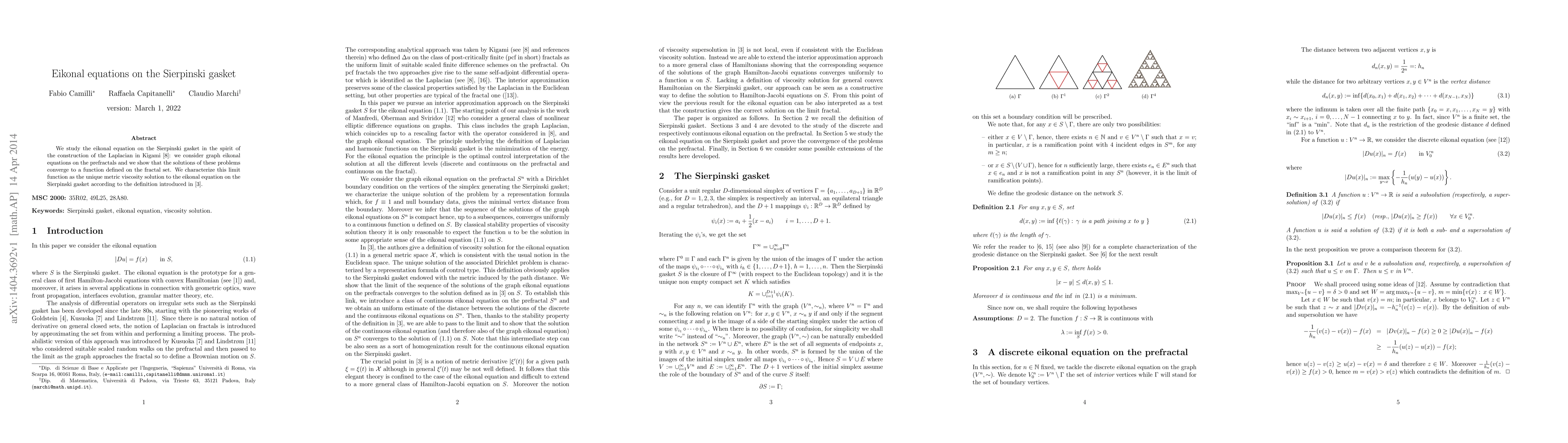 This paper investigates the convergence of graph eikonal equations on prefractals to a solution defined on the Sierpinski gasket, characterizing this limit as the unique metric viscosity solution to the eikonal equation on the fractal. The methodology follows Kigami's construction of the Laplacian on fractals.