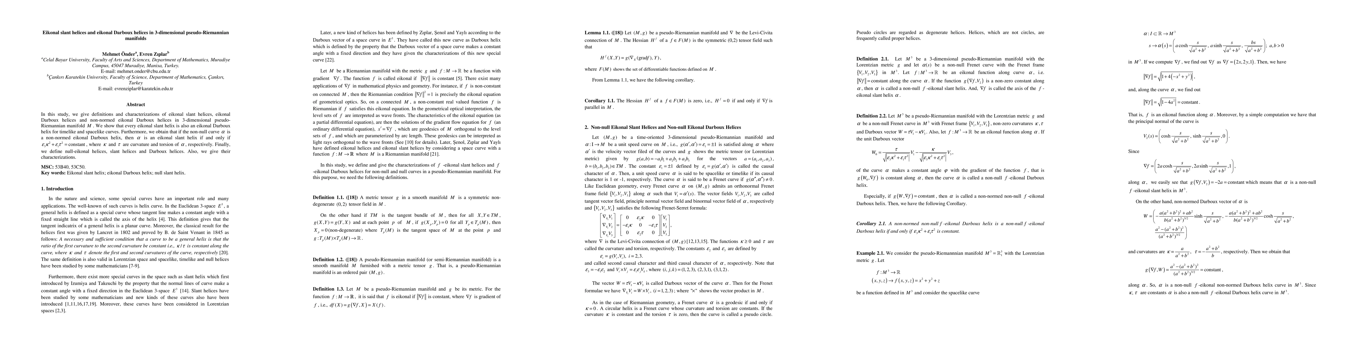 In this study, we give definitions and characterizations of eikonal slant helices, eikonal Darboux helices and non-normed eikonal Darboux helices in 3-dimensional pseudo- Riemannian manifold M . We show that every eikonal slant helix is also an eikonal Darboux helix for timelike and spacelike curves. Furthermore, we obtain that if the non-null curve a is a non-normed eikonal Darboux helix, then a is an eikonal slant helix if and only if 2 2 e 3k +e1t = constant, where k and t are curvature and torsion of a, respectively. Finally, we define null-eikonal helices, slant helices and Darboux helices. Also, we give their characterizations.