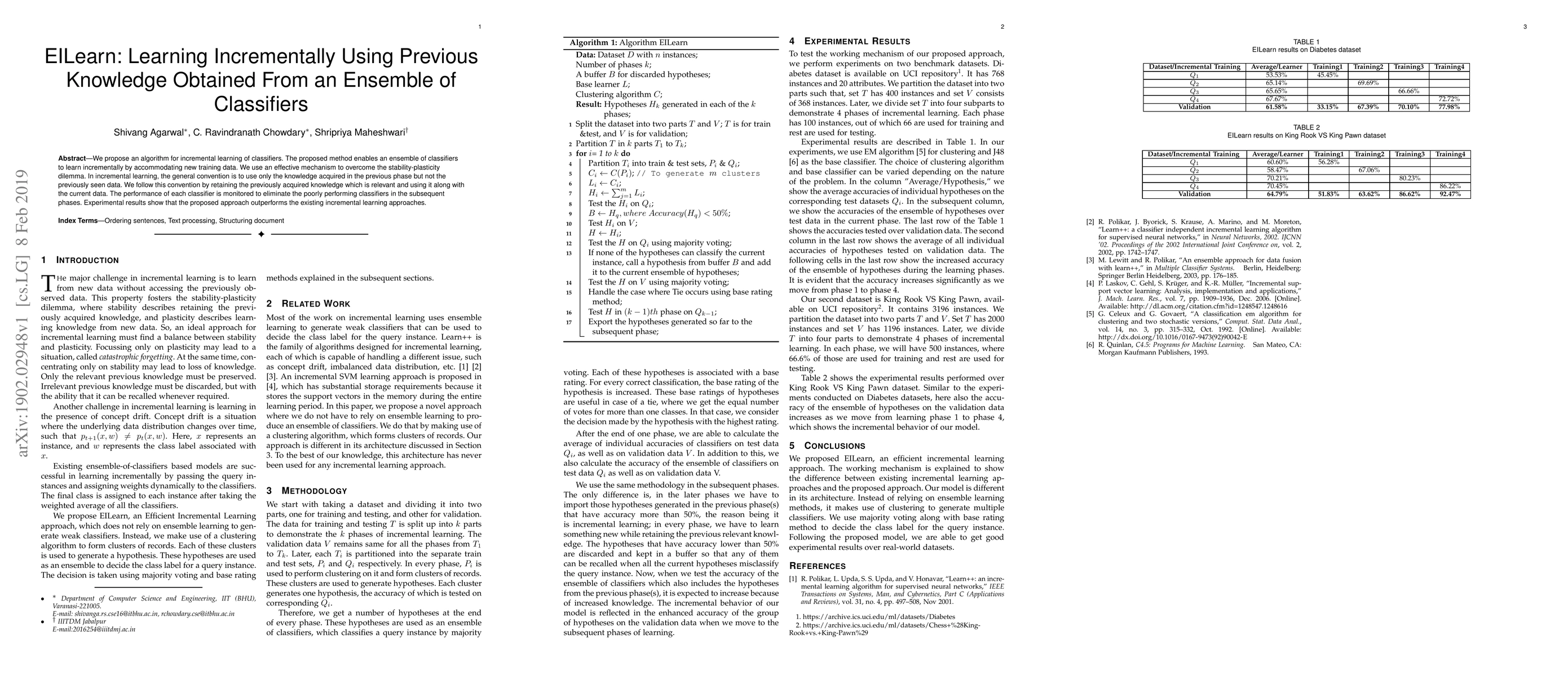 We propose an algorithm for incremental learning of classifiers. The proposed method enables an ensemble of classifiers to learn incrementally by accommodating new training data. We use an effective mechanism to overcome the stability-plasticity dilemma. In incremental learning, the general convention is to use only the knowledge acquired in the previous phase but not the previously seen data. We follow this convention by retaining the previously acquired knowledge which is relevant and using it along with the current data. The performance of each classifier is monitored to eliminate the poorly performing classifiers in the subsequent phases. Experimental results show that the proposed approach outperforms the existing incremental learning approaches.
