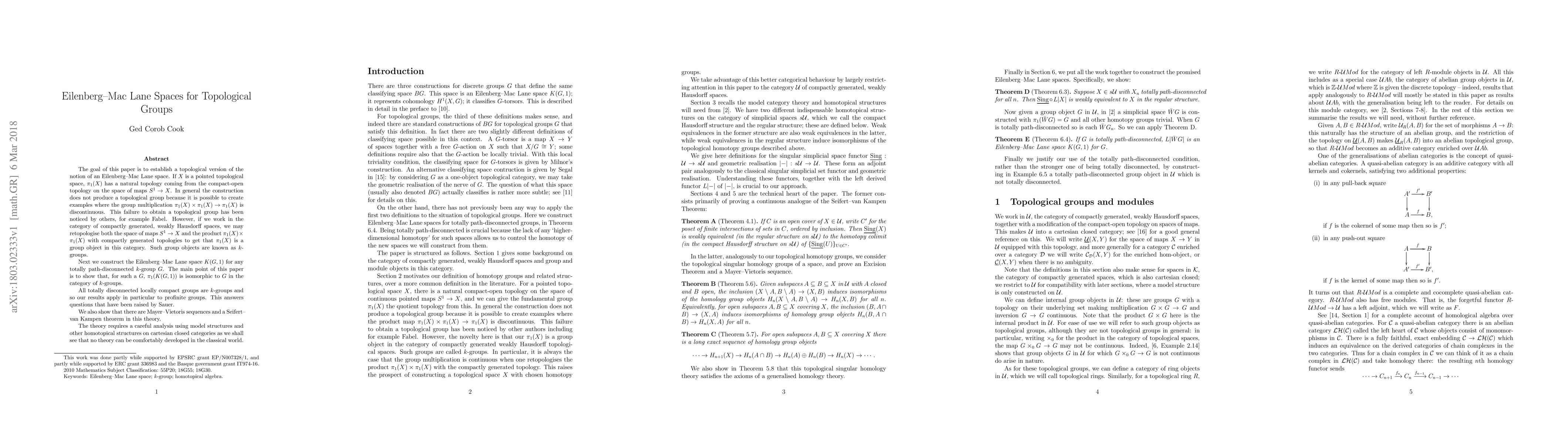 The goal of this paper is to establish a topological version of the notion of an Eilenberg-Mac Lane space. If $X$ is a pointed topological space, $\pi_1(X)$ has a natural topology coming from the compact-open topology on the space of maps $S^1 \to X$. In general the construction does not produce a topological group because it is possible to create examples where the group multiplication $\pi_1(X) \times \pi_1(X) \to \pi_1(X)$ is discontinuous. This failure to obtain a topological group has been noticed by others, for example Fabel. However, if we work in the category of compactly generated, weakly Hausdorff spaces, we may retopologise both the space of maps $S^1 \to X$ and the product $\pi_1(X) \times \pi_1(X)$ with compactly generated topologies to get that $\pi_1(X)$ is a group object in this category. Such group objects are known as $k$-groups. Next we construct the Eilenberg-Mac Lane space $K(G,1)$ for any totally path-disconnected $k$-group $G$. The main point of this paper is to show that, for such a $G$, $\pi_1(K(G,1))$ is isomorphic to $G$ in the category of $k$-groups. All totally disconnected locally compact groups are $k$-groups and so our results apply in particular to profinite groups. This answers questions that have been raised by Sauer. We also show that there are Mayer-Vietoris sequences and a Seifert-van Kampen theorem in this theory. The theory requires a careful analysis using model structures and other homotopical structures on cartesian closed categories as we shall see that no theory can be comfortably developed in the classical world.