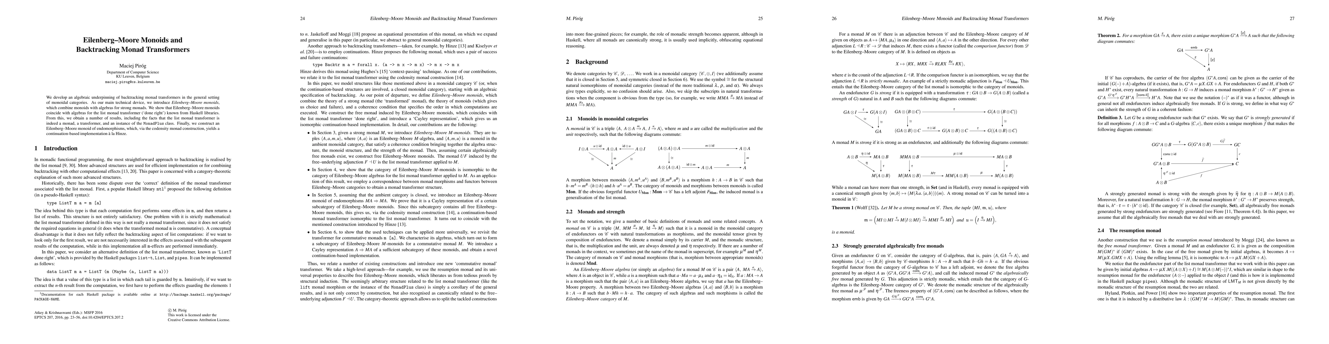 The paper develops an algebraic framework for backtracking monad transformers using Eilenberg-Moore monoids in monoidal categories, proving the list monad transformer's properties and constructing a continuation-based implementation.