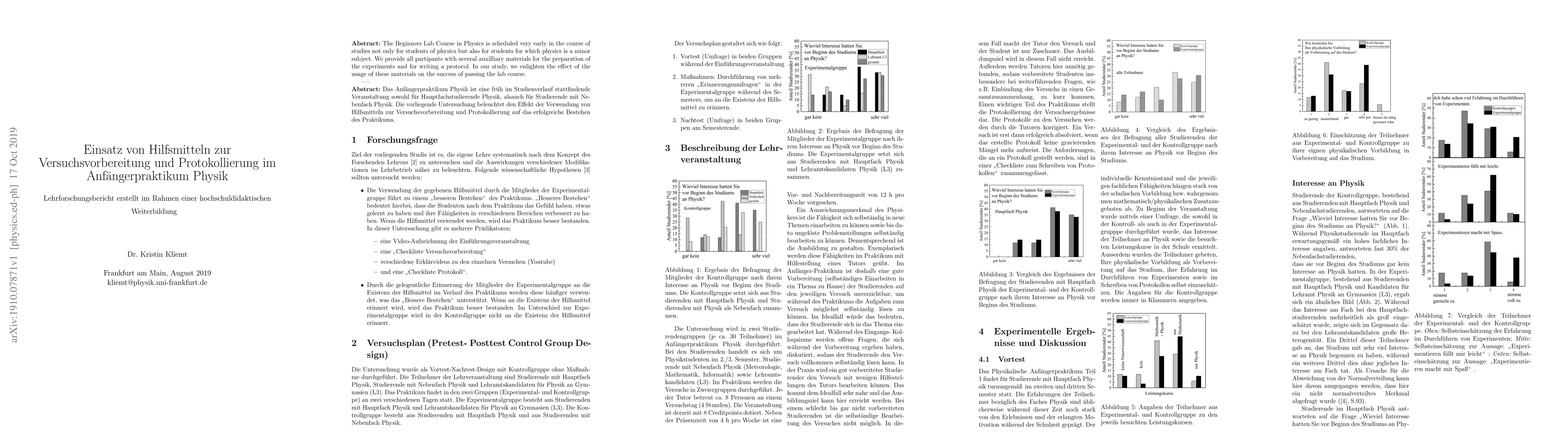 The Beginners Lab Course in Physics is scheduled very early in the course of studies not only for students of physics but also for students for which physics is a minor subject. We provide all partipants with several auxilliary materials for the preparation of the experiments and for writing a protocol. In our study, we enlighten the effect of the usage of these materials on the success of passing the lab course. ----- Das Anf\"angerpraktikum Physik ist eine fr\"uh im Studienverlauf stattfindende Veranstaltung sowohl f\"ur Hauptfachstudierende Physik, alsauch f\"ur Studierende mit Nebenfach Physik. Die vorliegende Untersuchung beleuchtet den Effekt der Verwendung von Hilfsmitteln zur Versuchsvorbereitung und Protokollierung auf das erfolgreiche Bestehen des Praktikums.