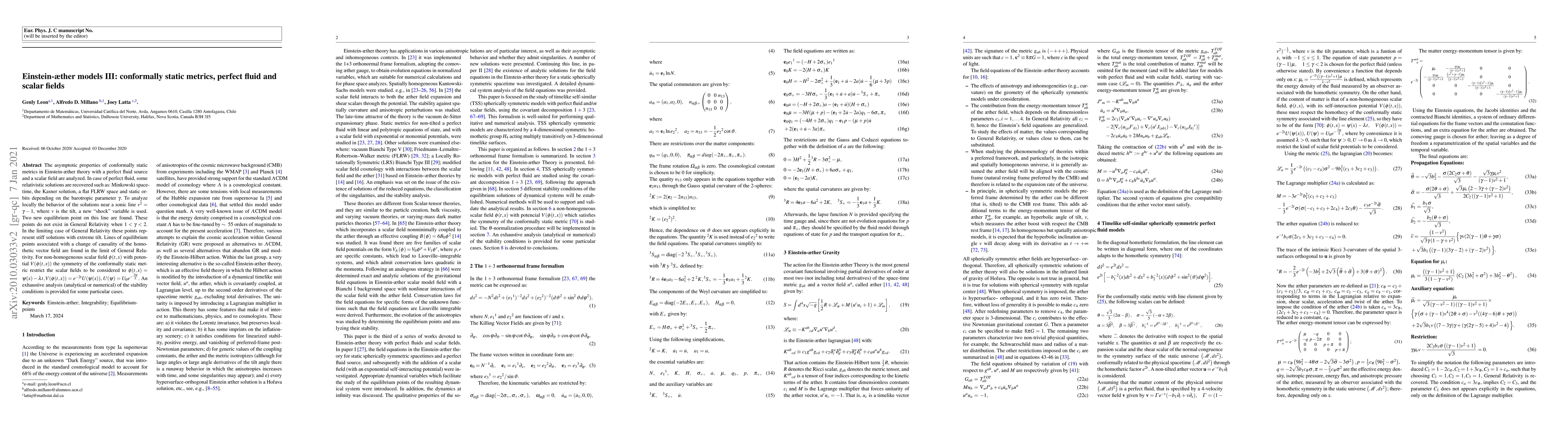 The asymptotic properties of conformally static metrics in Einstein-aether theory with a perfect fluid source and a scalar field are analyzed. In case of perfect fluid, some relativistic solutions are recovered such as: Minkowski spacetime, the Kasner solution, a flat FLRW space and static orbits depending on the barotropic parameter $\gamma$. To analyze locally the behavior of the solutions near a sonic line $v^2=\gamma-1$, where $v$ is the tilt, a new "shock" variable is used. Two new equilibrium point on this line are found. These points do not exist in General Relativity when $1 <\gamma<2 $. In the limiting case of General Relativity these points represent stiff solutions with extreme tilt. Lines of equilibrium points associated with a change of causality of the homothetic vector field are found in the limit of General Relativity. For non-homogeneous scalar field $\phi(t,x)$ with potential $V(\phi(t,x))$ the symmetry of the conformally static metric restrict the scalar fields to be considered to $ \phi(t,x)=\psi (x)-\lambda t, V(\phi(t,x))= e^{-2 t} U(\psi(x))$, $U(\psi)=U_0 e^{-\frac{2 \psi}{\lambda}}$. An exhaustive analysis (analytical or numerical) of the stability conditions is provided for some particular cases.