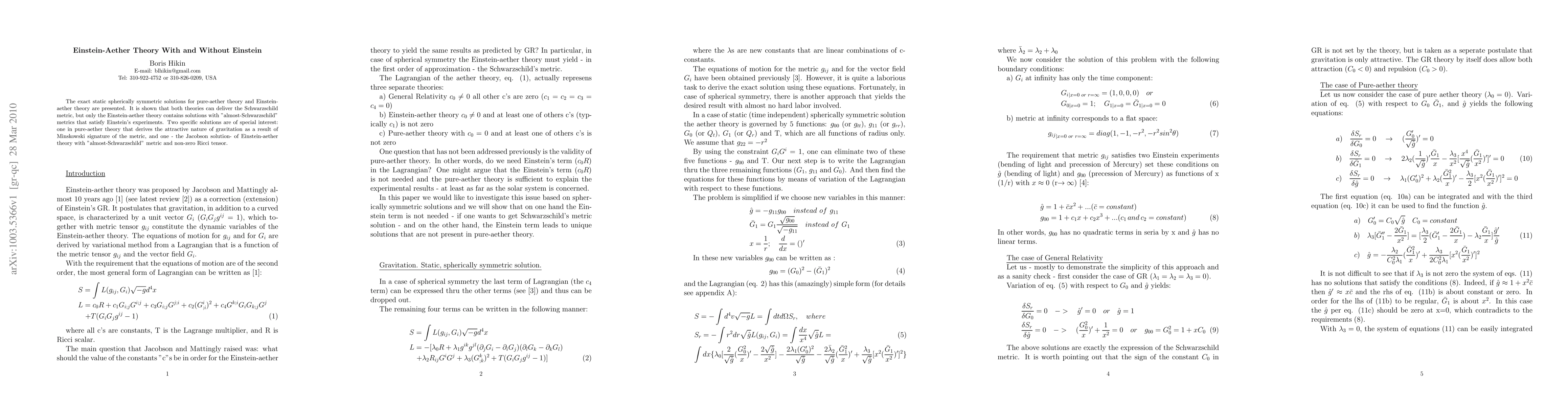The exact static spherically symmetric solutions for pure-aether theory and Einstein-aether theory are presented. It is shown that both theories can deliver the Schwarzschild metric, but only the Einstein-aether theory contains solutions with "almost-Schwarzschild" metrics that satisfy Einstein's experiments. Two specific solutions are of special interest: one in pure-aether theory that derives the attractive nature of gravitation as a result of Minskowski signature of the metric, and one - the Jacobson solution- of Einstein-aether theory with "almost-Schwarzschild" metric and non-zero Ricci tensor.