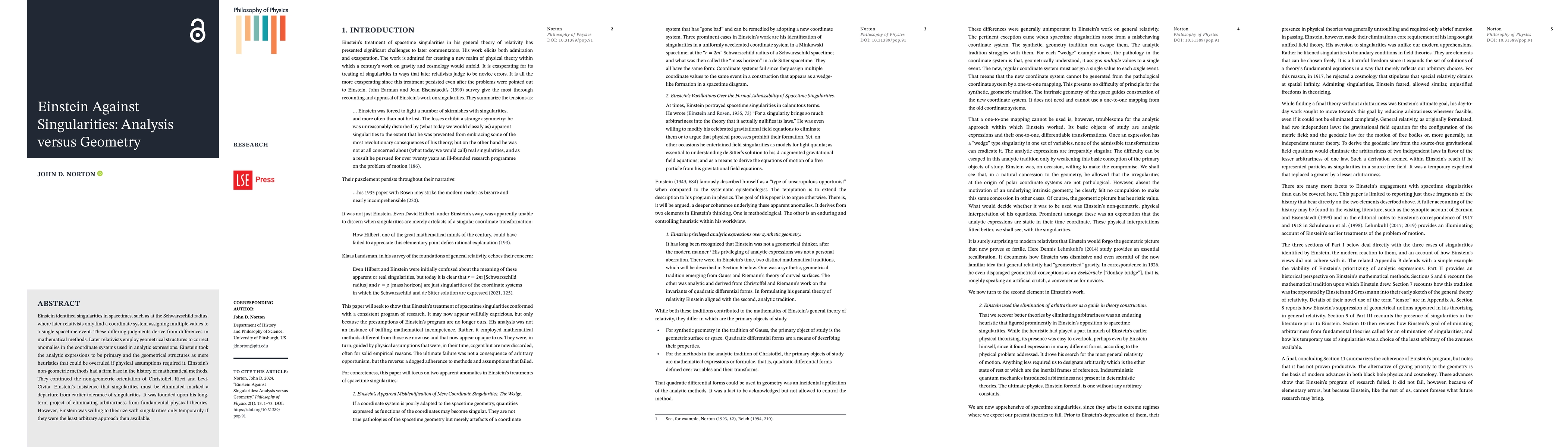 Einstein identified singularities in spacetimes, such as at the Schwarzschild radius, where later relativists only find a coordinate system assigning multiple values to a single spacetime event. These differing judgments derive from differences in mathematical methods. Later relativists employ geometrical structures to correct anomalies in the coordinate systems used in analytic expressions. Einstein took the analytic expressions to be primary and the geometrical structures as mere heuristics that could be overruled if physical assumptions required it. Einstein's non-geometric methods had a firm base in the history of mathematical methods. They continued the non-geometric orientation of Christoffel, Ricci and LeviCivita. Einstein's insistence that singularities must be eliminated marked a departure from earlier tolerance of singularities. It was founded upon his longterm project of eliminating arbitrariness from fundamental physical theories. However, Einstein was willing to theorize with singularities only temporarily if they were the least arbitrary approach then available.