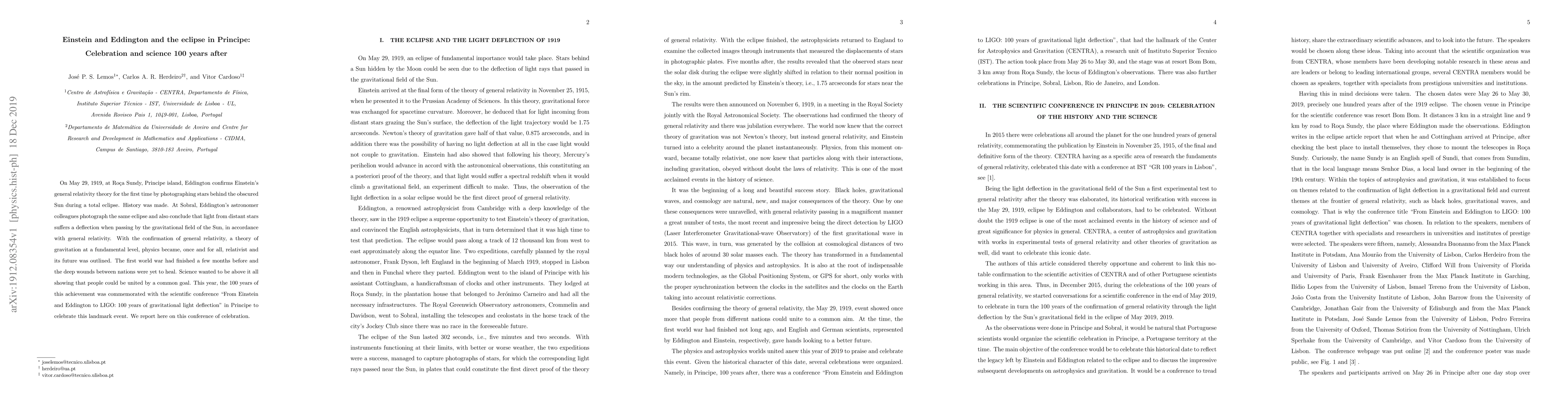 On May 29, 1919, at Ro\c{c}a Sundy, Principe island, Eddington confirms Einstein's general relativity theory for the first time by photographing stars behind the obscured Sun during a total eclipse. History was made. At Sobral, Eddington's astronomer colleagues photograph the same eclipse and also conclude that light from distant stars suffers a deflection when passing by the gravitational field of the Sun, in accordance with general relativity. With the confirmation of general relativity, a theory of gravitation at a fundamental level, physics became, once and for all, relativist and its future was outlined. The first world war had finished a few months before and the deep wounds between nations were yet to heal. Science wanted to be above it all showing that people could be united by a common goal. This year, the 100 years of this achievement was commemorated with the scientific conference "From Einstein and Eddington to LIGO: 100 years of gravitational light deflection" in Principe to celebrate this landmark event. We report here on this conference of celebration.