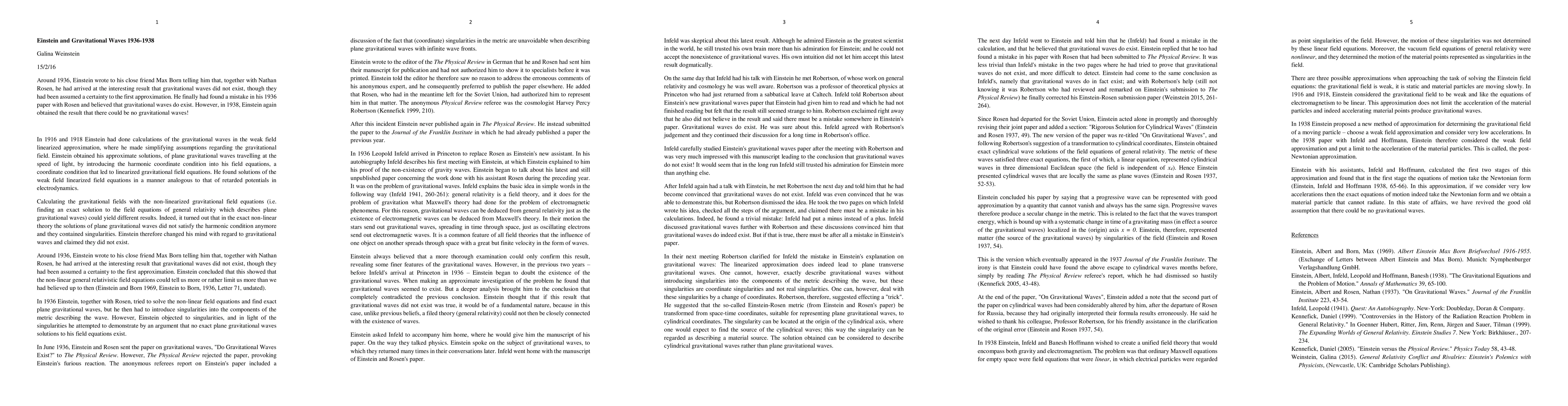 Summary: Einstein initially concluded with Nathan Rosen that gravitational waves do not exist, but later identified a flaw in their reasoning, asserting their existence. However, by 1938, he again found a new argument against the existence of gravitational waves, highlighting the complex evolution of his thoughts on the subject.