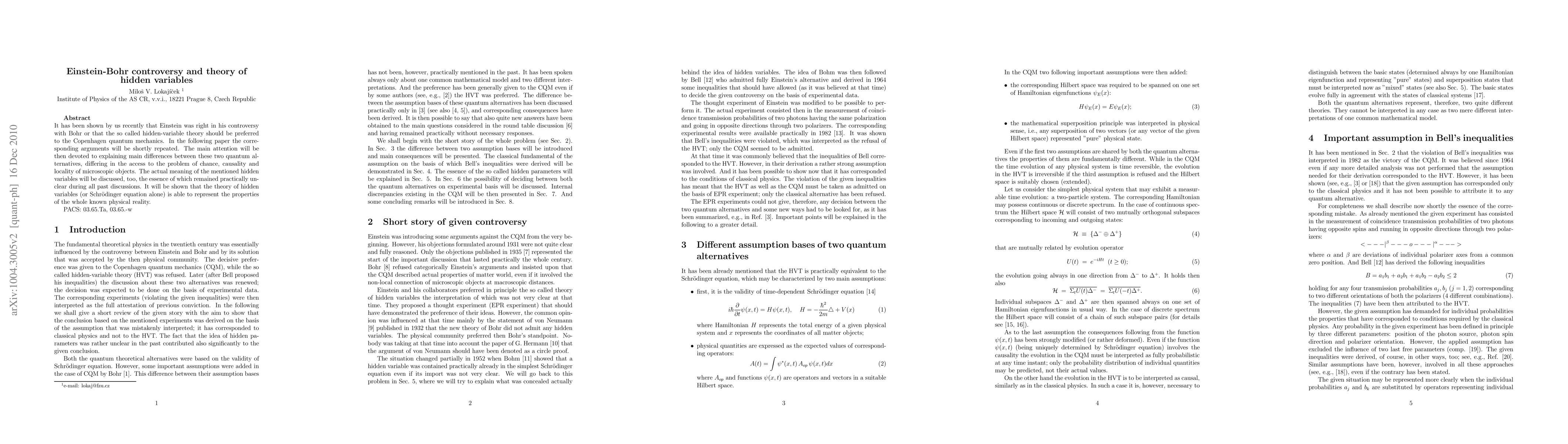 It has been shown by us recently that Einstein was right in his controversy with Bohr or that the so called hidden-variable theory should be preferred to the Copenhagen quantum mechanics. In the following paper the corresponding arguments will be shortly repeated. The main attention will be then devoted to explaining main differences between these two quantum alternatives, differing in the access to the problem of chance, causality and locality of microscopic objects. The actual meaning of the mentioned hidden variables will be discussed, too, the essence of which remained practically unclear during all past discussions. It will be shown that the theory of hidden variables (or Schroedinger equation alone) is able to represent the properties of the whole known physical reality.