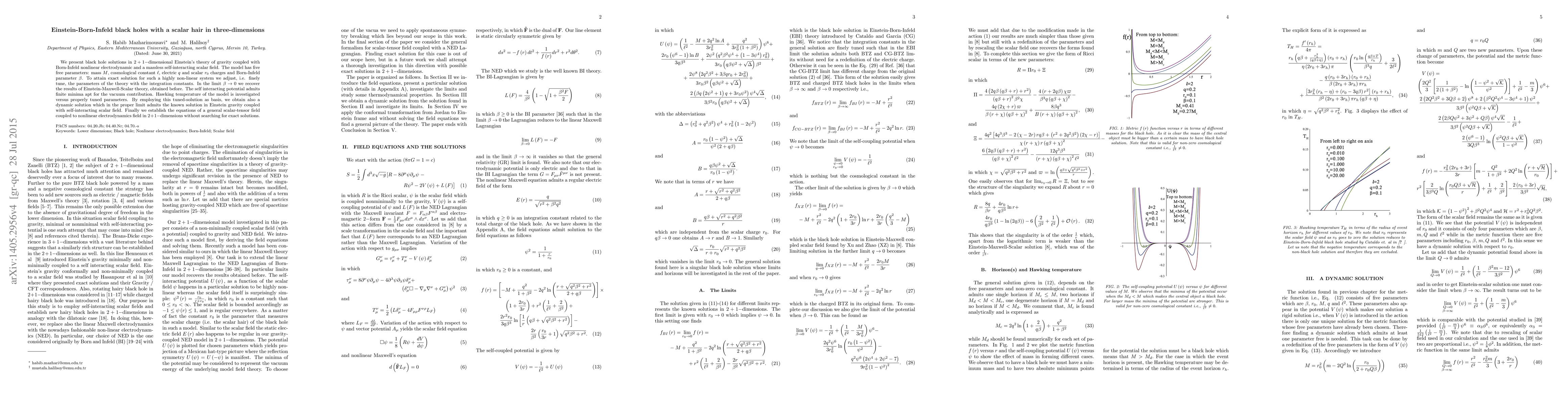 This paper presents black hole solutions in 2+1-dimensional gravity coupled with Born-Infeld electrodynamics and a massless scalar field, showing how to finely tune parameters to obtain exact solutions. The study also investigates the Hawking temperature and transitions to dynamic solutions, establishing general equations for scalar-tensor fields in 2+1 dimensions.