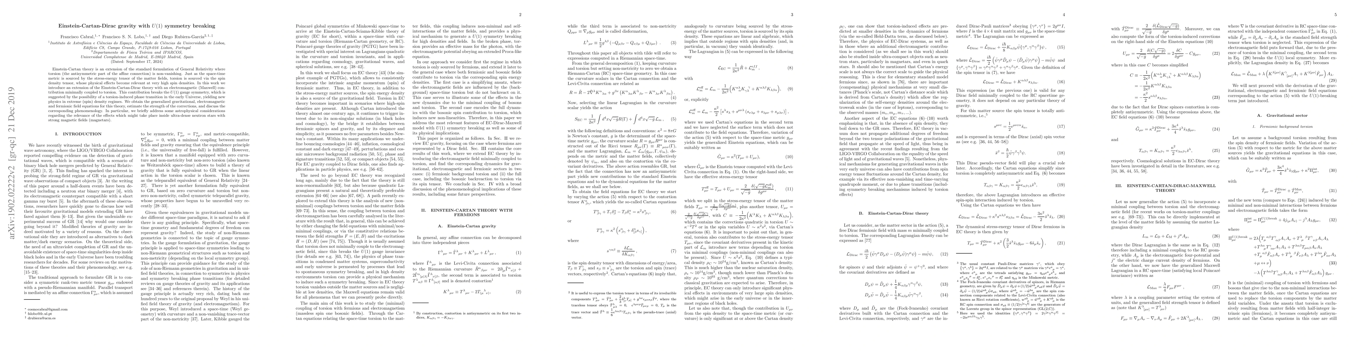 Einstein-Cartan theory is an extension of the standard formulation of General Relativity where torsion (the antisymmetric part of the affine connection) is non-vanishing. Just as the space-time metric is sourced by the stress-energy tensor of the matter fields, torsion is sourced via the spin density tensor, whose physical effects become relevant at very high spin densities. In this work we introduce an extension of the Einstein-Cartan-Dirac theory with an electromagnetic (Maxwell) contribution minimally coupled to torsion. This contribution breaks the $U(1)$ gauge symmetry, which is suggested by the possibility of a torsion-induced phase transition in the early Universe, yielding new physics in extreme (spin) density regimes. We obtain the generalized gravitational, electromagnetic and fermionic field equations for this theory, estimate the strength of the corrections, and discuss the corresponding phenomenology. In particular, we briefly address some astrophysical considerations regarding the relevance of the effects which might take place inside ultra-dense neutron stars with strong magnetic fields (magnetars).