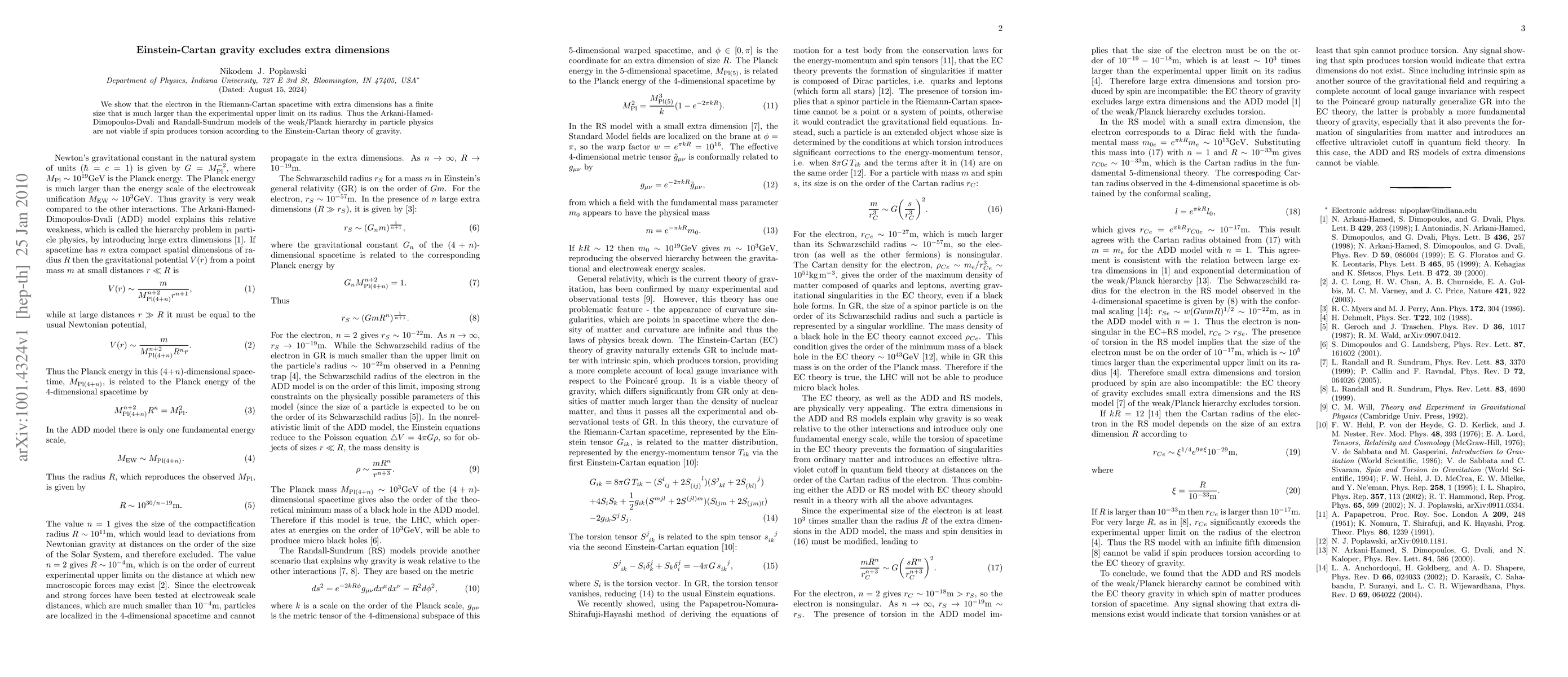 Summary: The study demonstrates that the Einstein-Cartan theory of gravity, which incorporates torsion, predicts an electron size far exceeding experimental limits, invalidating extra-dimensional models like those proposed by Arkani-Hamed et al. and Randall-Sundrum for explaining the hierarchy between weak and Planck forces.