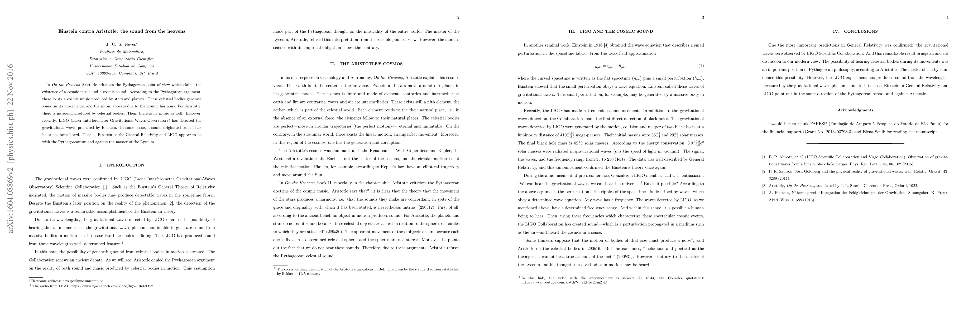 In "On the Heavens" Aristotle criticizes the Pythagorean point of view which claims the existence of a cosmic music and a cosmic sound. According to the Pythagorean argument, there exists a cosmic music produced by stars and planets. These celestial bodies generate sound in its movements, and the music appears due to the cosmic harmony. For Aristotle, there is no sound produced by celestial bodies. Then, there is no music as well. However, recently, LIGO (Laser Interferometer Gravitational-Waves Observatory) has detected the gravitational waves predicted by Einstein. In some sense, a sound originated from black holes has been heard. That is, Einstein or the General Relativity and LIGO appear to be with the Pythagoreanism and against the master of the Lyceum.