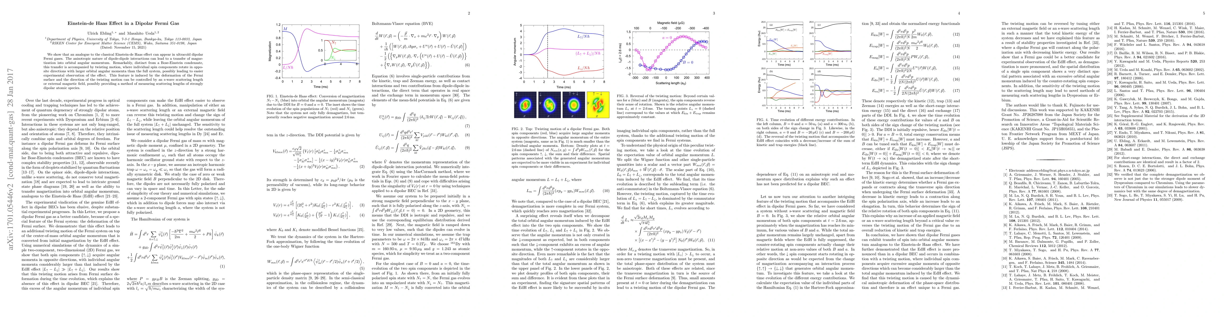 This paper demonstrates an analogue of the Einstein-de Haas effect in ultracold dipolar Fermi gases, where magnetization transfers to orbital angular momentum, causing distinct twisting motions. This effect is controlled by the s-wave scattering length or external magnetic field, potentially aiding in measuring scattering lengths in strongly dipolar atomic species.