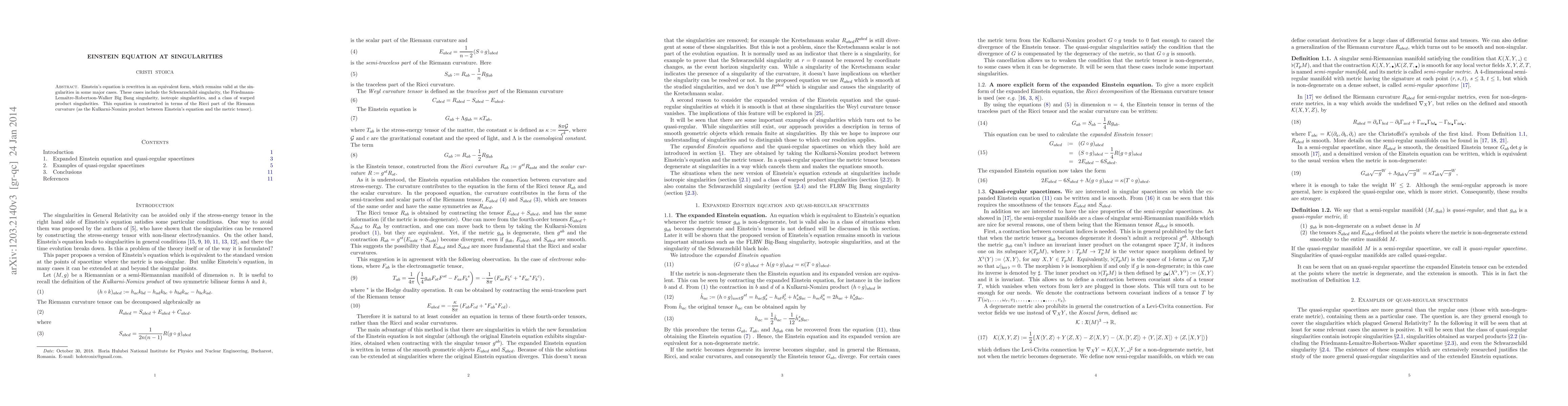 Einstein's equation is rewritten in an equivalent form, which remains valid at the singularities in some major cases. These cases include the Schwarzschild singularity, the Friedmann-Lema\^itre-Robertson-Walker Big Bang singularity, isotropic singularities, and a class of warped product singularities. This equation is constructed in terms of the Ricci part of the Riemann curvature (as the Kulkarni-Nomizu product between Einstein's equation and the metric tensor).
