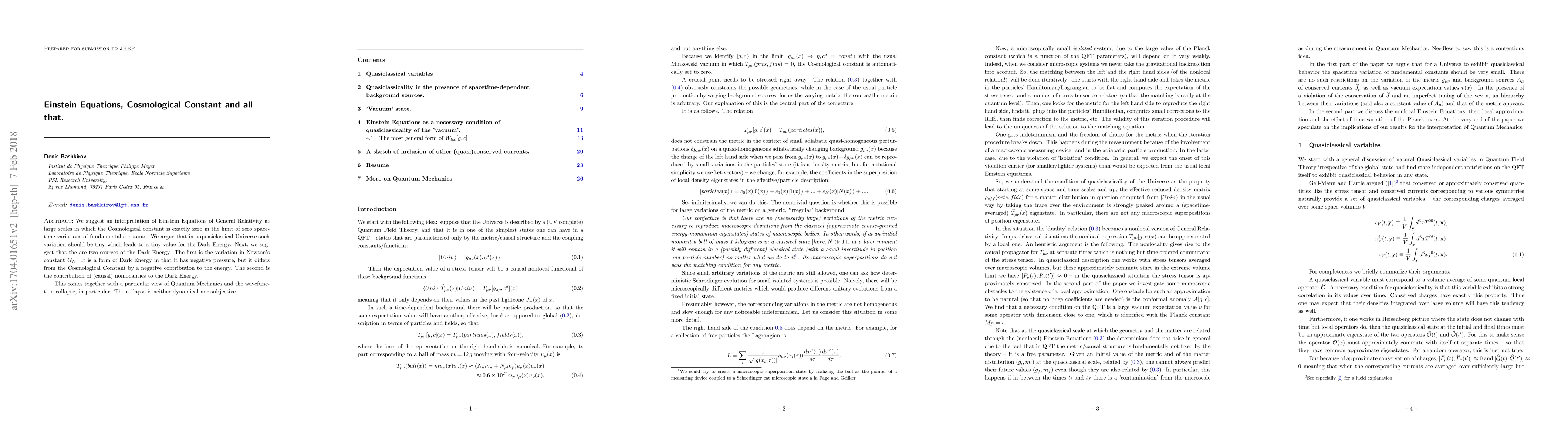 We suggest an interpretation of Einstein Equations of General Relativity at large scales in which the Cosmological constant is exactly zero in the limit of zero spacetime variations of fundamental constants. We argue that in a quasiclassical Universe such variation should be tiny which leads to a tiny value for the Dark Energy. Next, we suggest that the are two sources of the Dark Energy. The first is the variation in Newton's constant $G_N$. It is a form of Dark Energy in that it has negative pressure, but it differs from the Cosmological Constant by a negative contribution to the energy. The second is the contribution of (causal) nonlocalities to the Dark Energy. This comes together with a particular view of Quantum Mechanics and the wavefunction collapse, in particular. The collapse is neither dynamical nor subjective.
