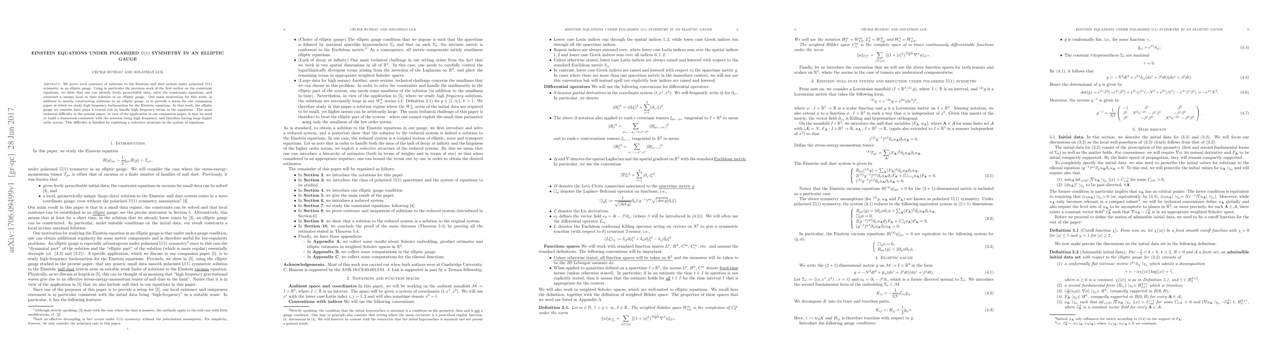 We prove local existence of solutions to the Einstein--null dust system under polarized $\mathbb U(1)$ symmetry in an elliptic gauge. Using in particular the previous work of the first author on the constraint equations, we show that one can identify freely prescribable data, solve the constraints equations, and construct a unique local in time solution in an elliptic gauge. Our main motivation for this work, in addition to merely constructing solutions in an elliptic gauge, is to provide a setup for our companion paper in which we study high frequency backreaction for the Einstein equations. In that work, the elliptic gauge we consider here plays a crucial role to handle high frequency terms in the equations. The main technical difficulty in the present paper, in view of the application in our companion paper, is that we need to build a framework consistent with the solution being high frequency, and therefore having large higher order norms. This difficulty is handled by exploiting a reductive structure in the system of equations.