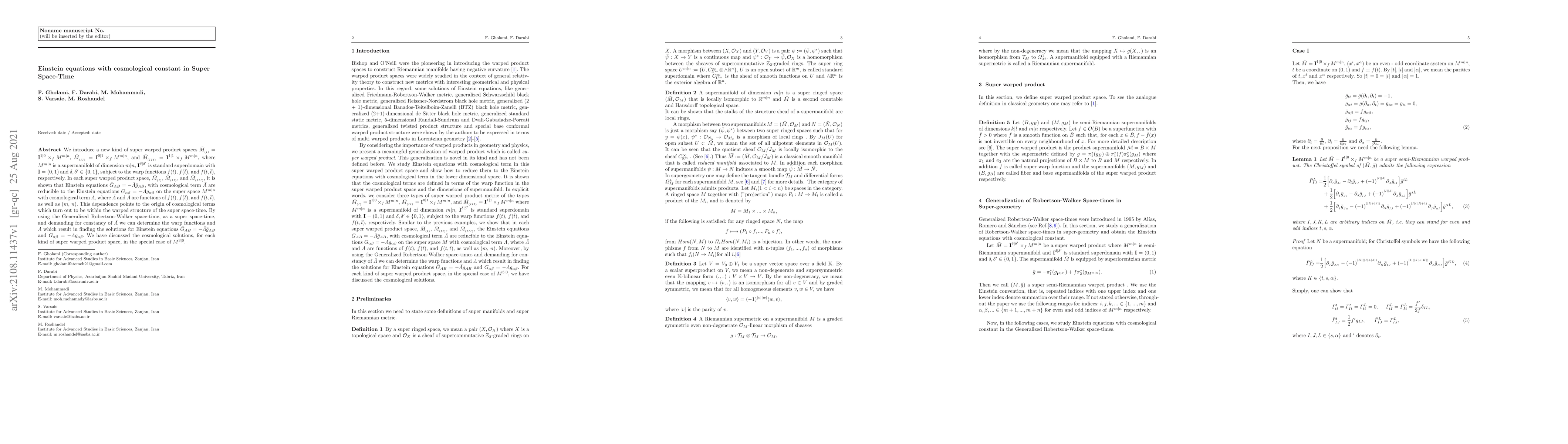 This paper explores new super warped product spaces and demonstrates that Einstein equations with a cosmological constant in these spaces reduce to standard Einstein equations on the underlying supermanifolds, with cosmological terms originating from the warped structure. Solutions for these equations are determined using the Generalized Robertson-Walker space-time.