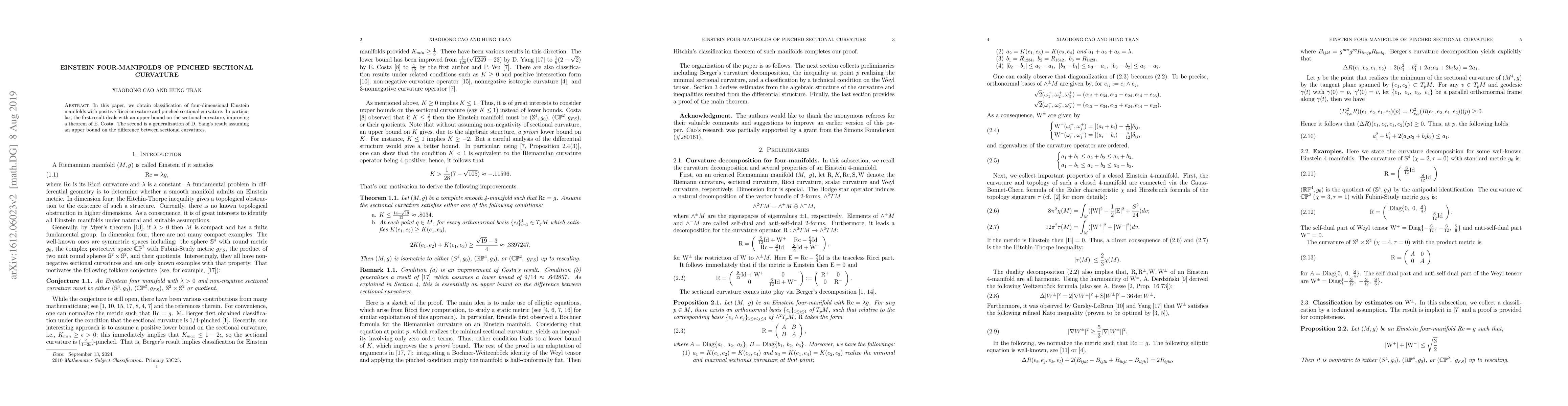 This paper classifies four-dimensional Einstein manifolds with positive Ricci curvature and pinched sectional curvature, establishing an upper bound on the sectional curvature and generalizing previous results on the difference between sectional curvatures.