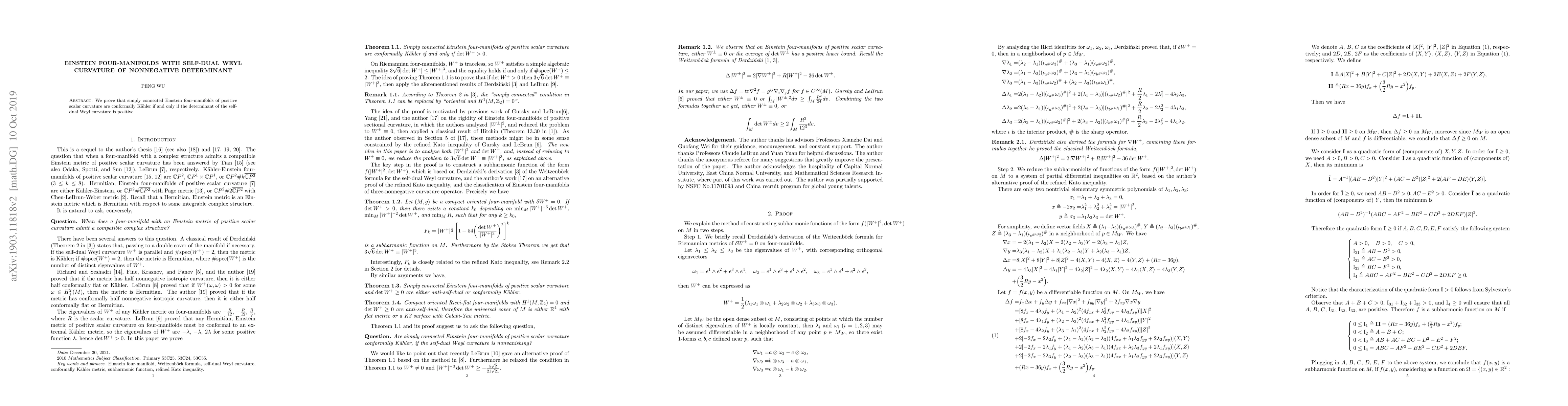Summary: This paper establishes that simply connected Einstein four-manifolds with positive scalar curvature are conformally Kähler if and only if the determinant of their self-dual Weyl curvature is positive. This provides a condition linking the geometry of the manifold to its curvature properties.