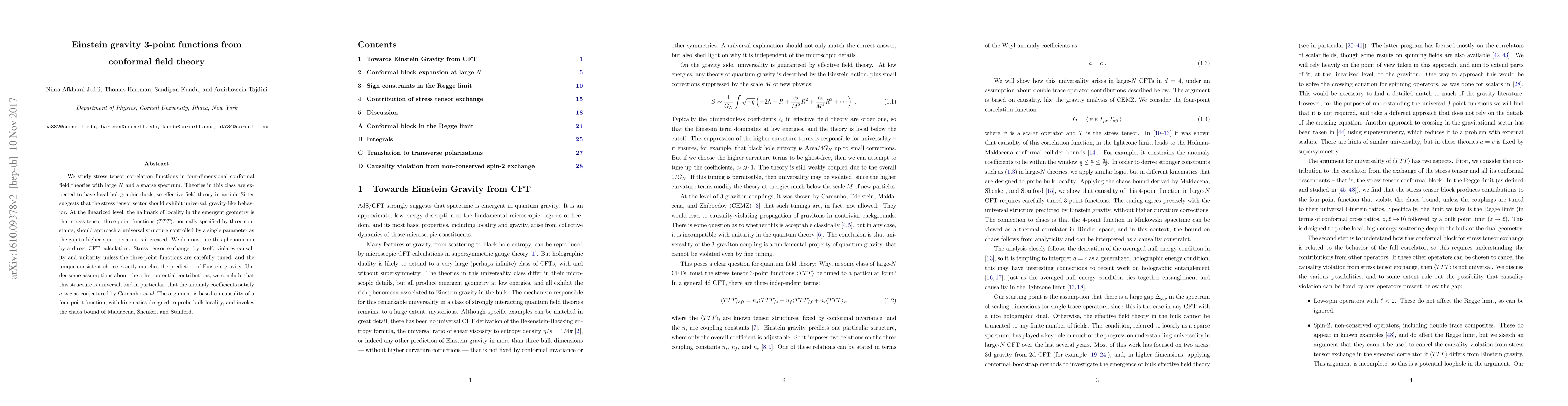 Researchers study stress tensor correlation functions in conformal field theories to find a universal structure that matches Einstein gravity predictions. They demonstrate the emergence of gravity-like behavior with a single parameter controlling the three-point function.