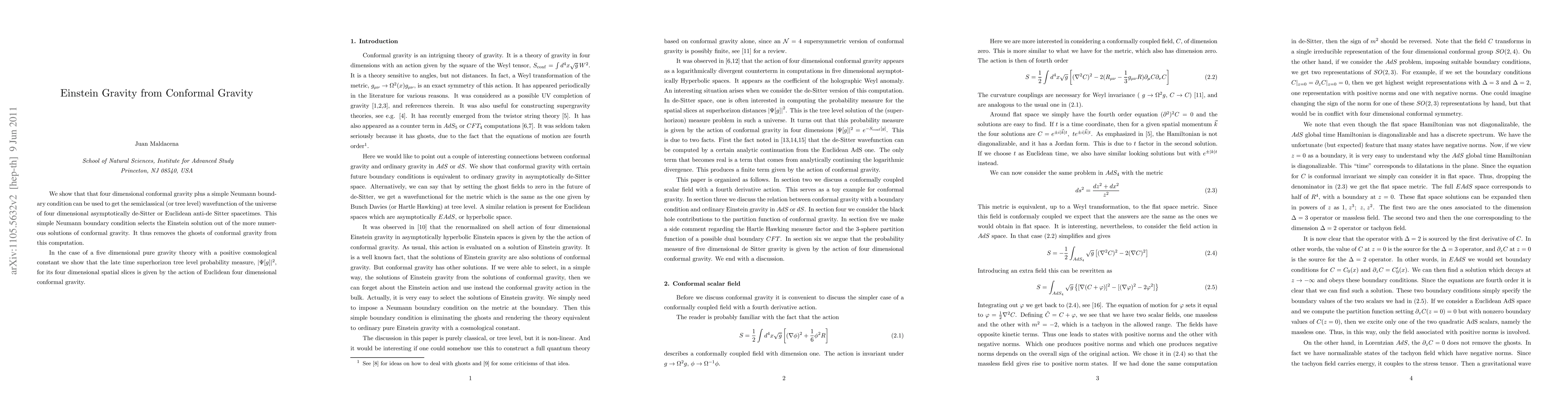 This paper demonstrates that four-dimensional conformal gravity, combined with a Neumann boundary condition, yields the semiclassical wavefunction of the universe in de-Sitter or anti-de Sitter spacetimes, effectively selecting the Einstein solution and eliminating conformal gravity's ghosts. Additionally, it shows that five-dimensional pure gravity with a positive cosmological constant results in a late-time superhorizon probability measure derived from four-dimensional Euclidean conformal gravity.