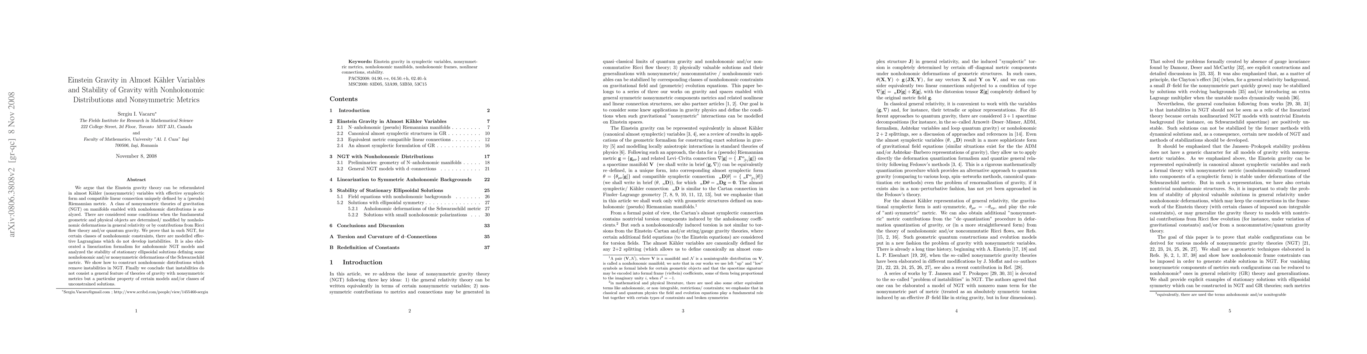 The paper reformulates Einstein gravity using almost Kahler variables and examines stability in nonsymmetric theories of gravitation with nonholonomic distributions. It demonstrates that certain nonholonomic constraints can eliminate instabilities in these theories and concludes that such instabilities are not inherent but model-specific.
