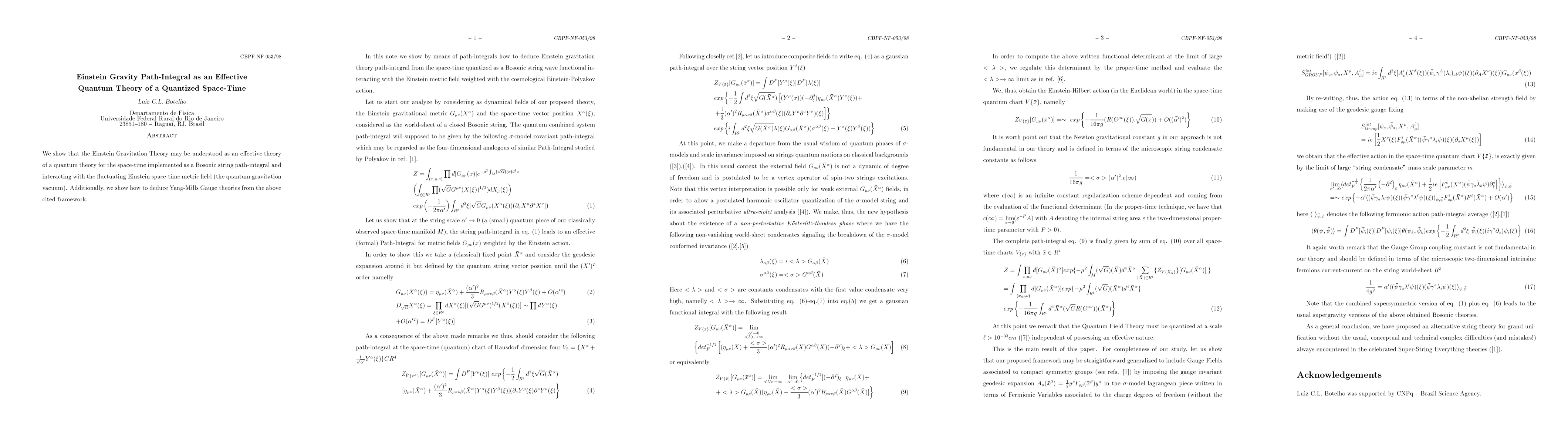 Researchers propose that Einstein gravity theory can be understood as an effective quantum theory for space-time implemented as a Bosonic string path integral, interacting with its own metric field.