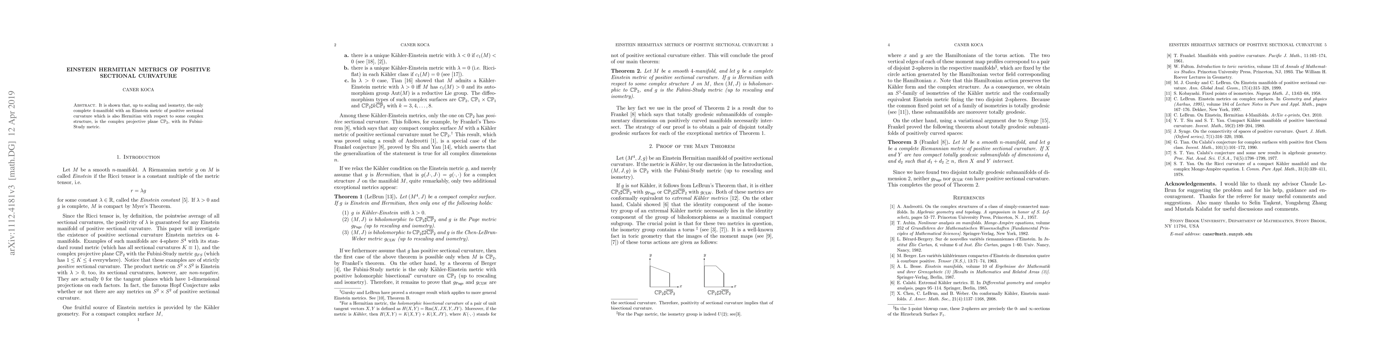 The research used a combination of existing results from Calabi, Frankel, LeBrun, and Tian to prove that the only compact 4-manifold M with an Einstein metric of positive sectional curvature which is also hermitian with respect to some complex structure on M, is the complex projective plane CP^2, with its Fubini-Study metric.