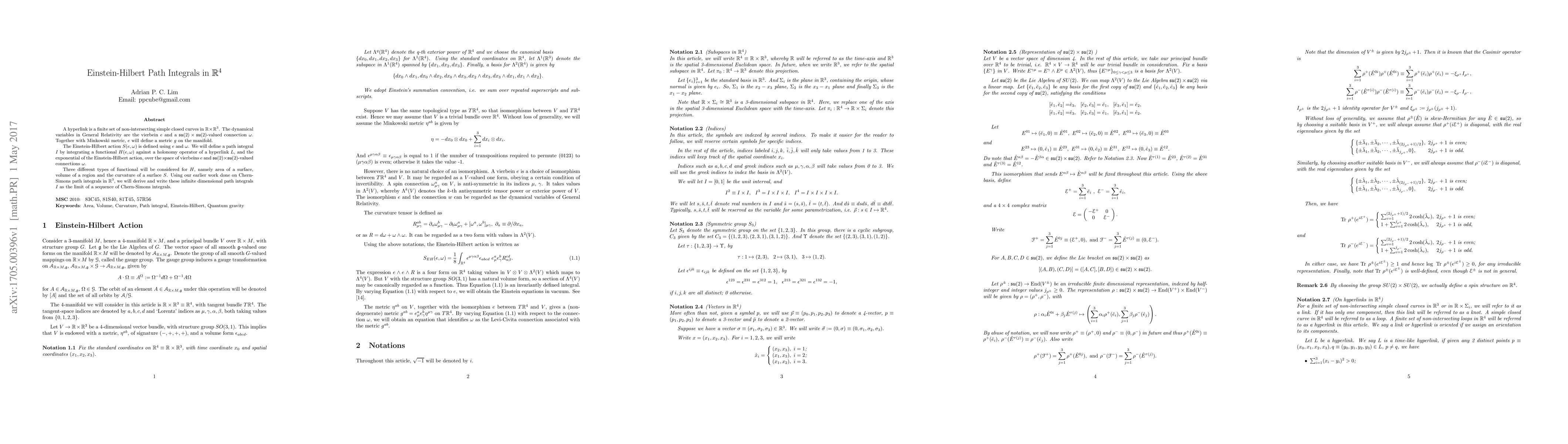 This research paper explores Einstein-Hilbert path integrals in $mathbb{R}^4$, using hyperlinks as finite sets of curves in $mathbb{R} imes mathbb{R}^3$. The dynamical variables, vierbein $e$ and $mathfrak{su}(2) imesmathfrak{su}(2)$-valued connection $omega$, define a metric $g$. The path integral $I$ is constructed by integrating a functional $H(e,omega)$, involving area, volume, or curvature, against a hyperlink's holonomy operator and the exponential of the Einstein-Hilbert action. The paper derives these infinite-dimensional path integrals as limits of Chern-Simons integrals from previous work in $mathbb{R}^3$.
